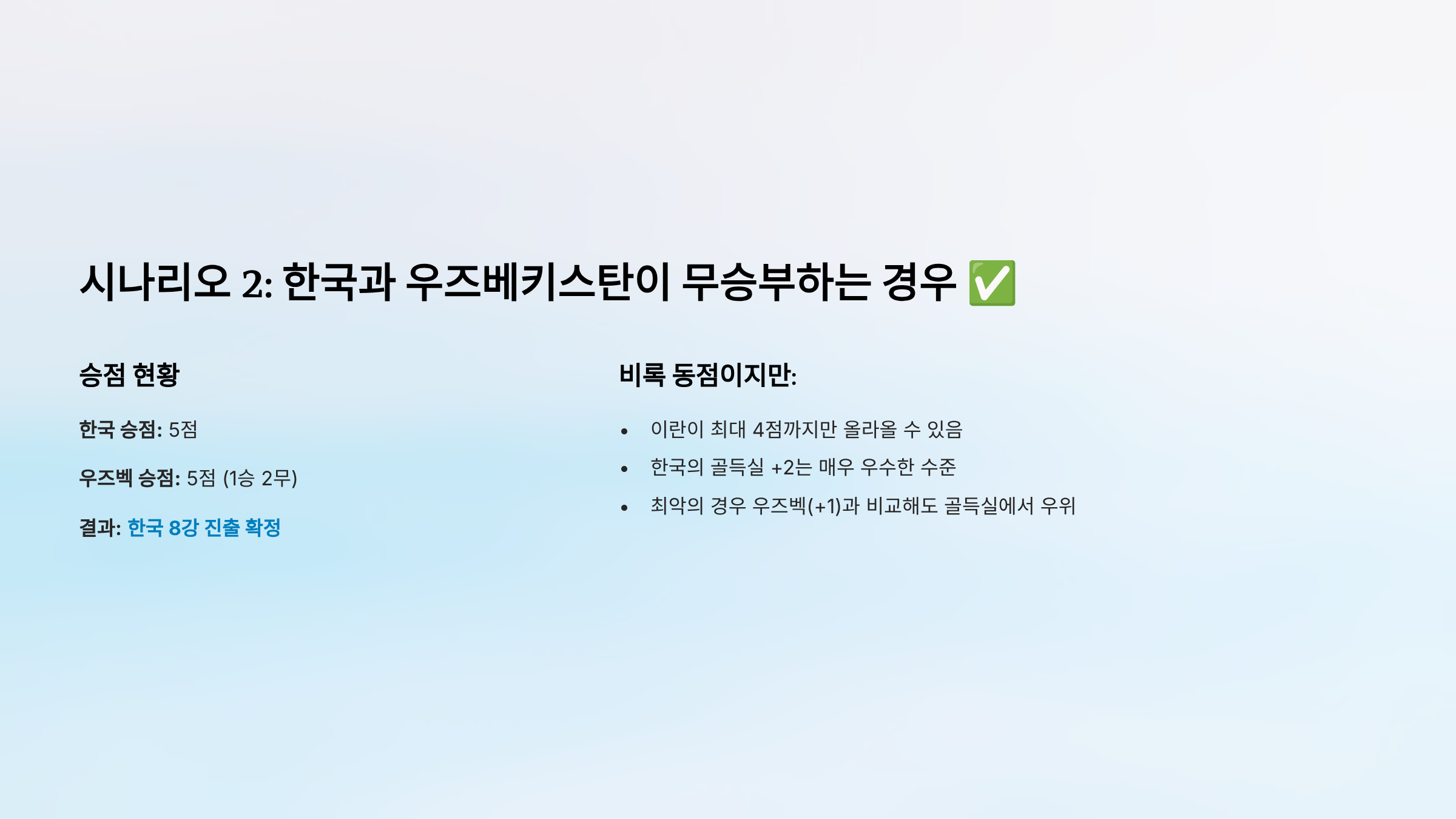 시나리오 2: 한국과 우즈베키스탄이 무승부하는 경우 ✅