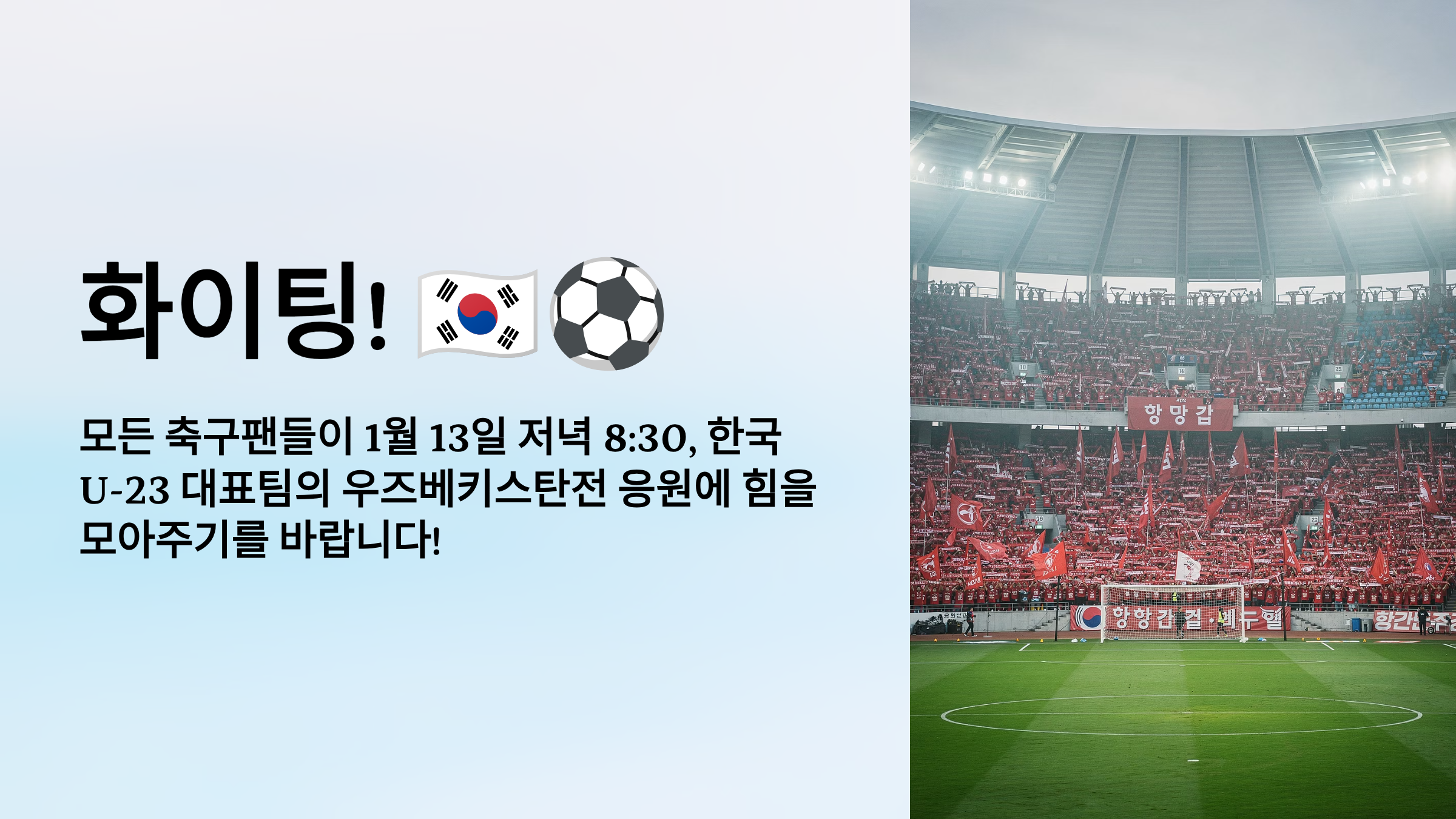 모든 축구팬들이 1월 13일 저녁 8:30, 한국 U-23 대표팀의 우즈베키스탄전 응원에 힘을 모아주기를 바랍니다!