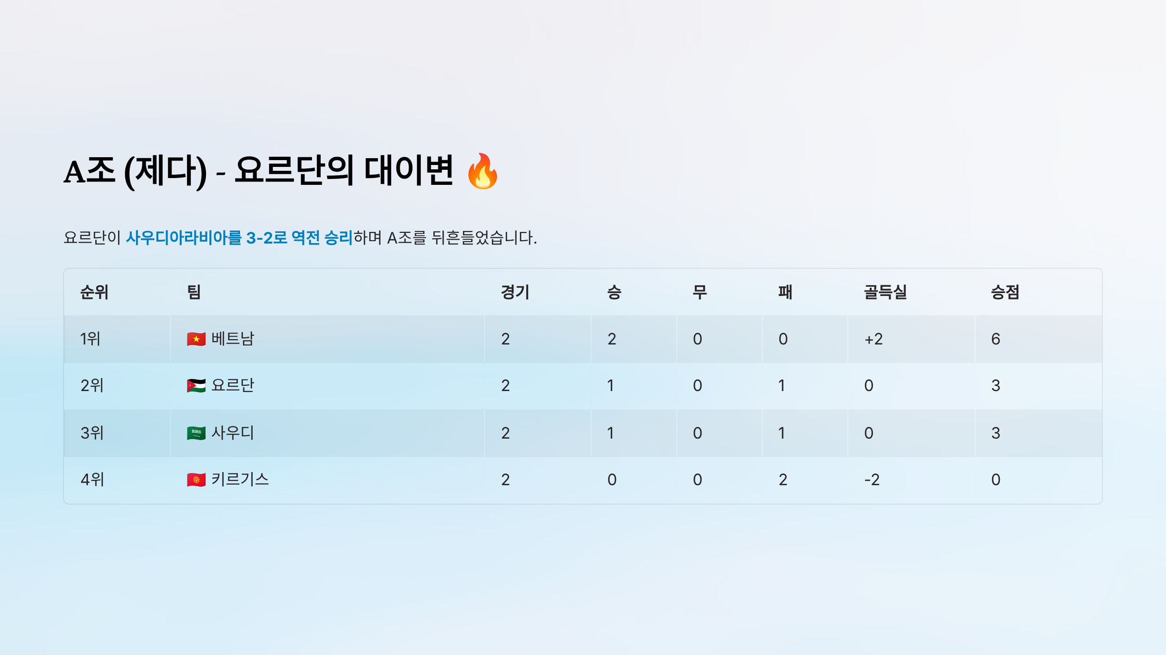 - 요르단의 3-2 역전승이 A조 전체 판도 변화