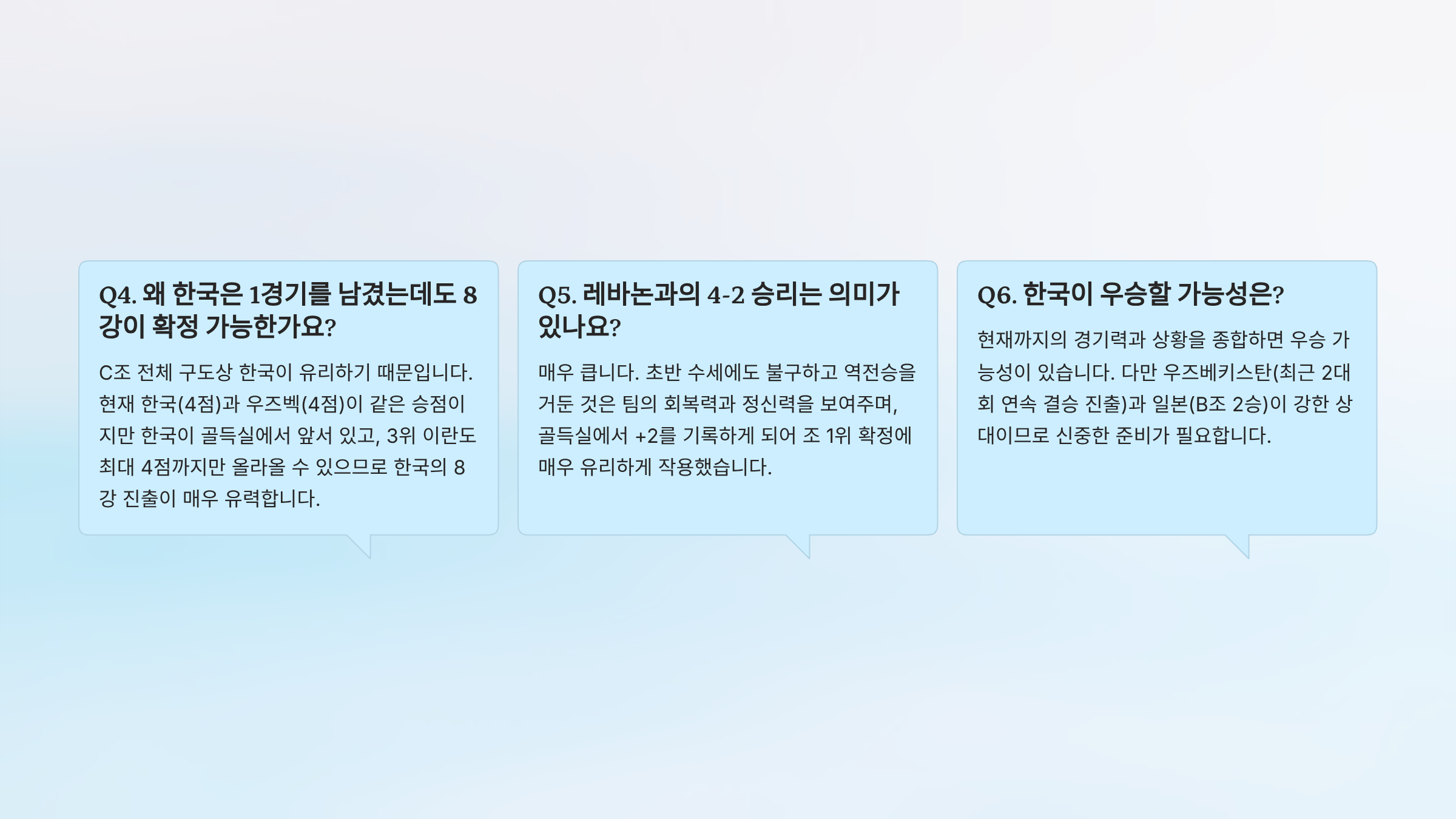 A. 현재까지의 경기력과 상황을 종합하면 우승 가능성이 있습니다. 다만 우즈베키스탄(최근 2대회 연속 결승 진출)과 일본(B조 2승)이 강한 상대이므로 신중한 준비가 필요합니다.