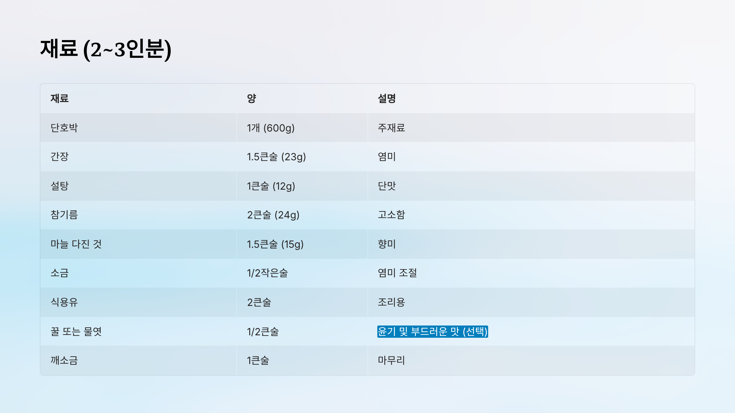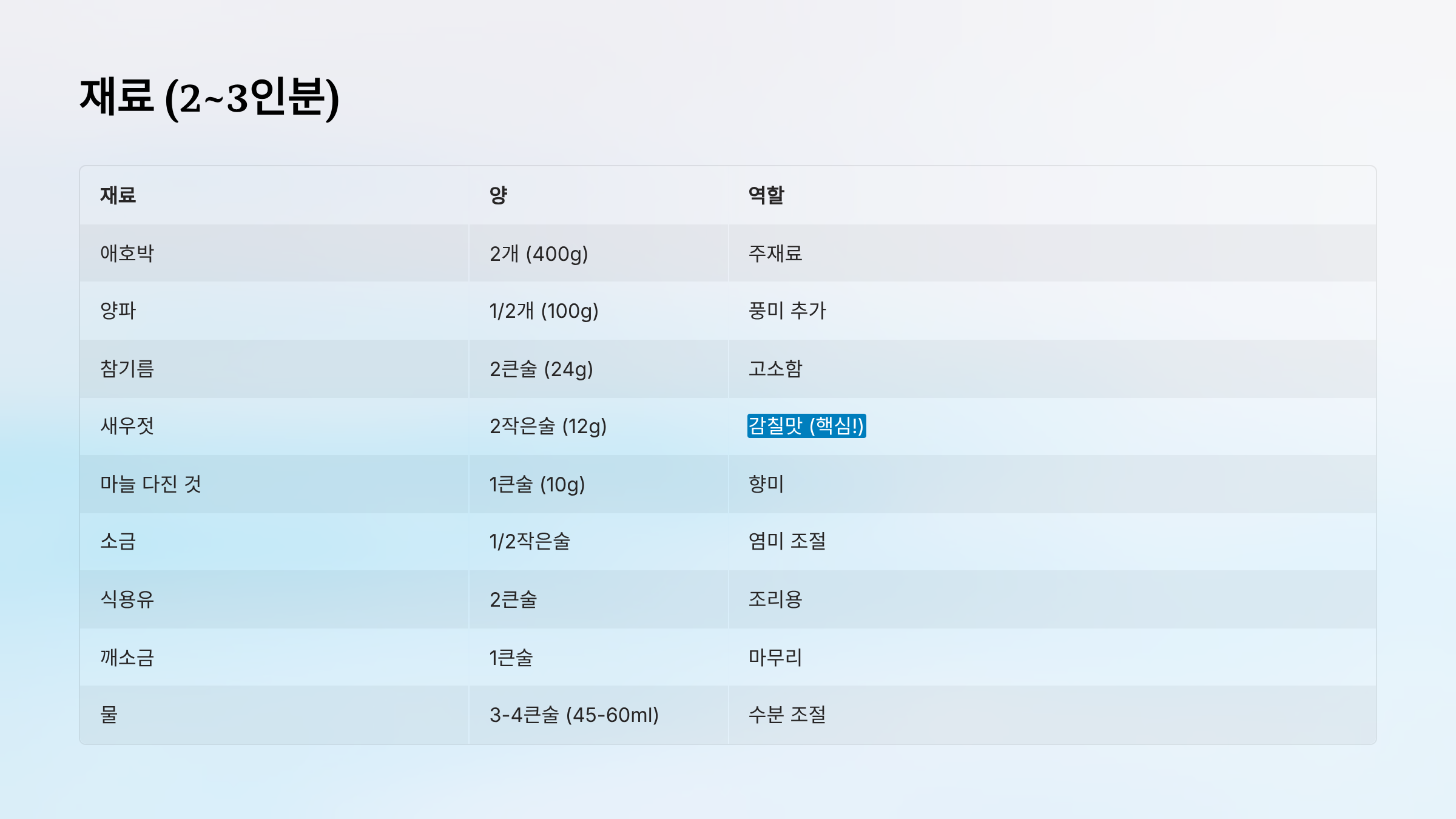 - 애호박: 1큰술 추가 (총 2큰술)