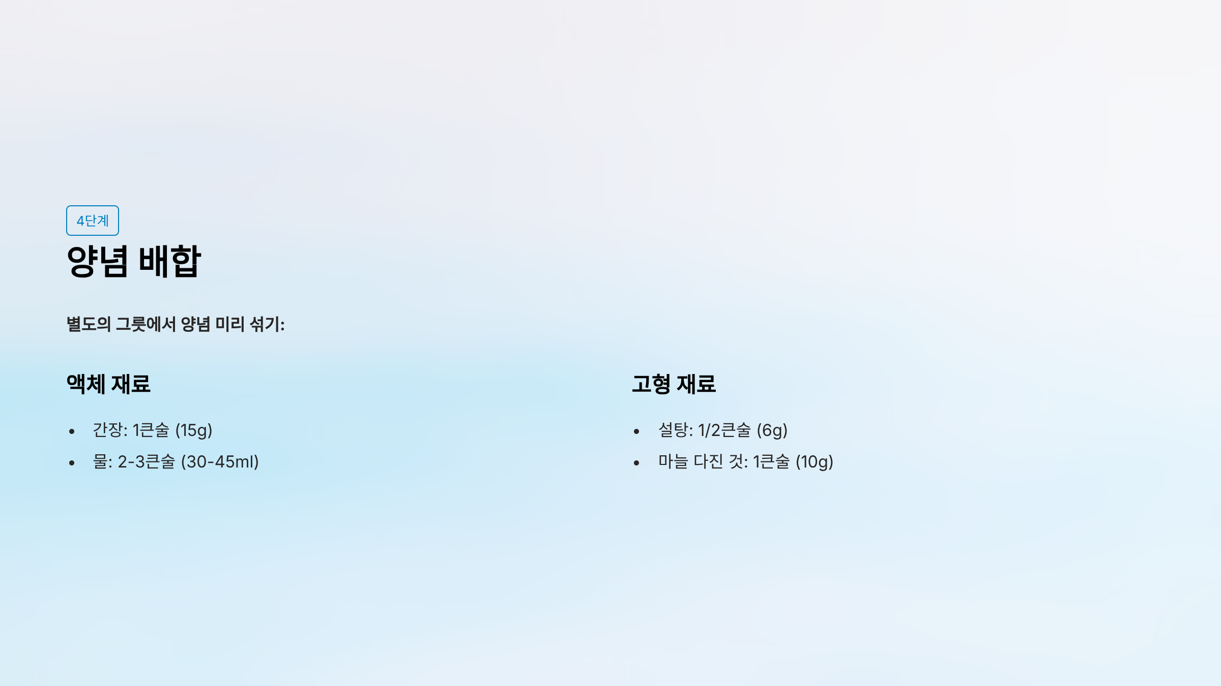 | 물 | 3~4큰술 (45~60ml) | 수분 조절 |