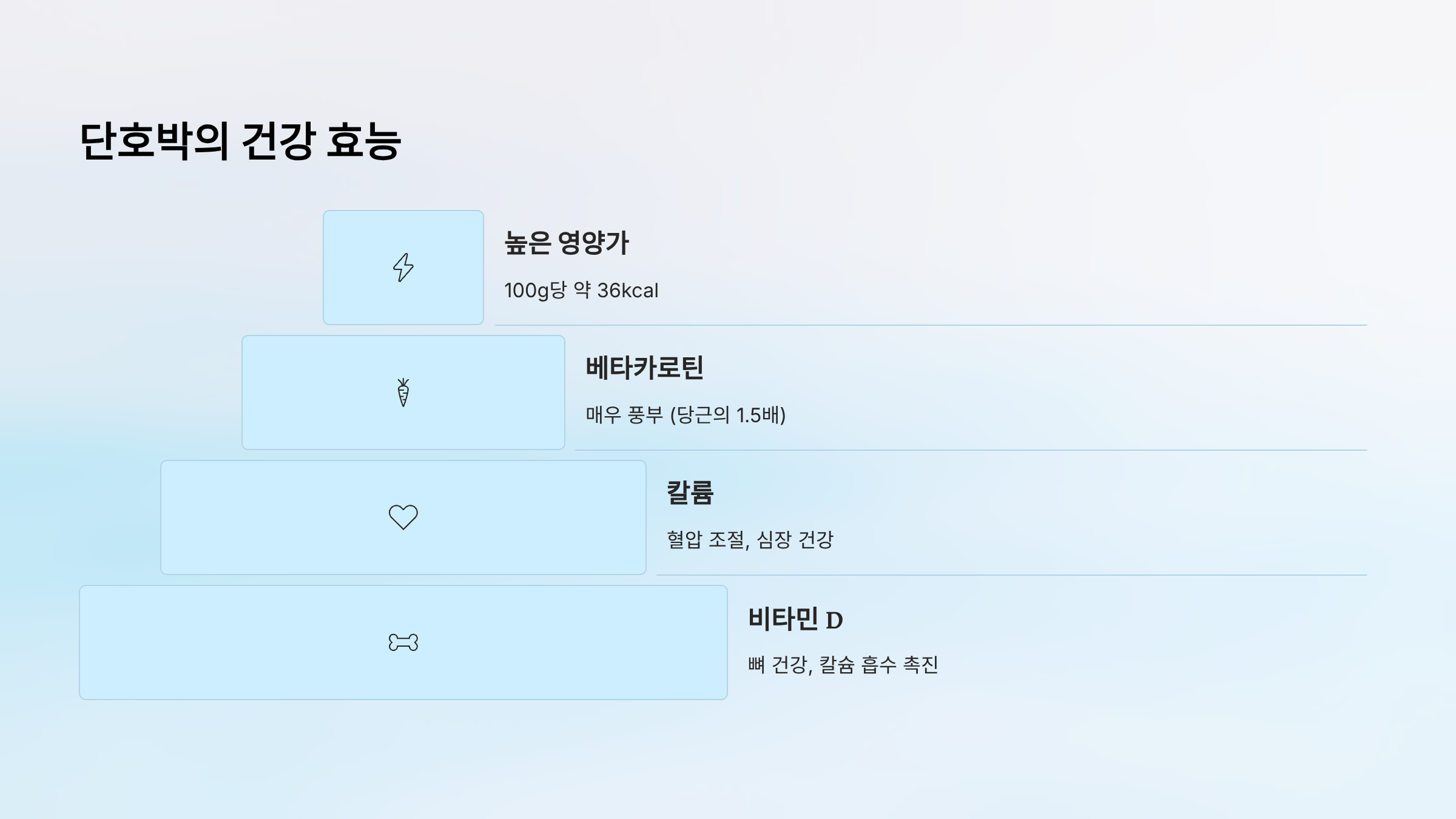 1. 높은 영양가: 100g당 약 36kcal (애호박보다 높음)