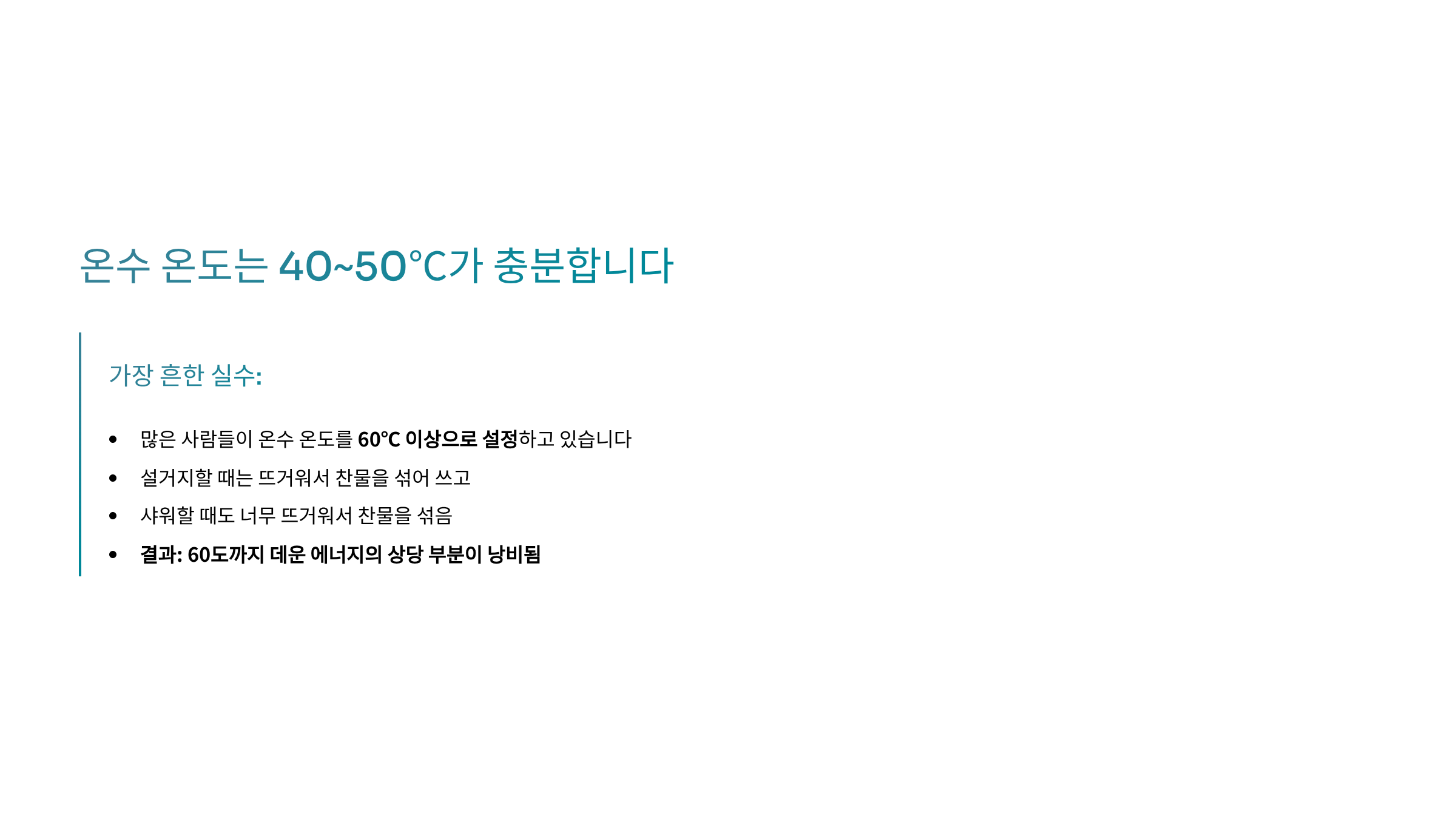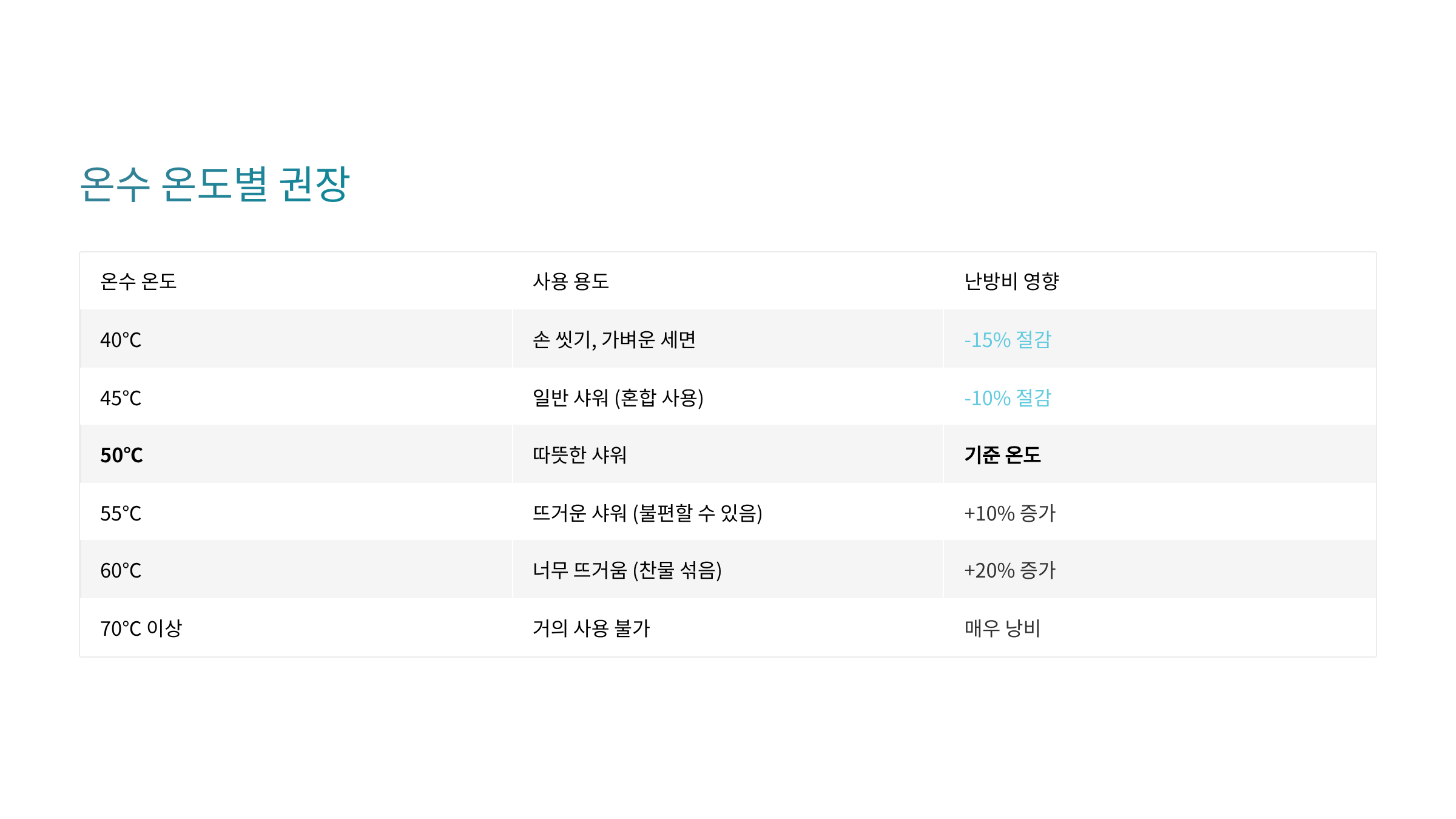| 40℃ | 손 씻기, 가벼운 세면 | -15% 절감 |