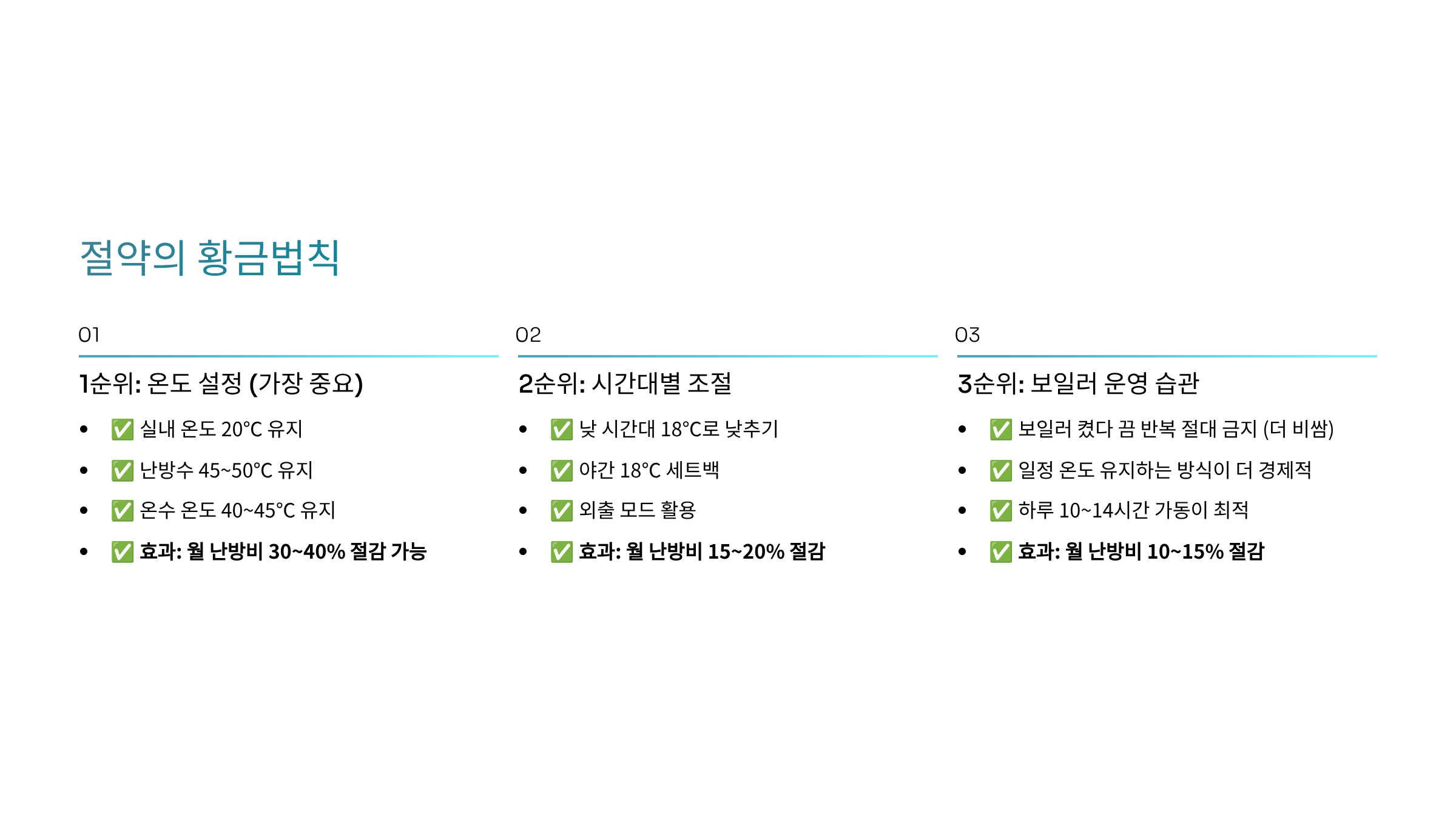 - 45~50℃의 난방수 온도가 가장 효율적입니다 (40℃ 이하면 비효율, 60℃ 이상은 낭비)