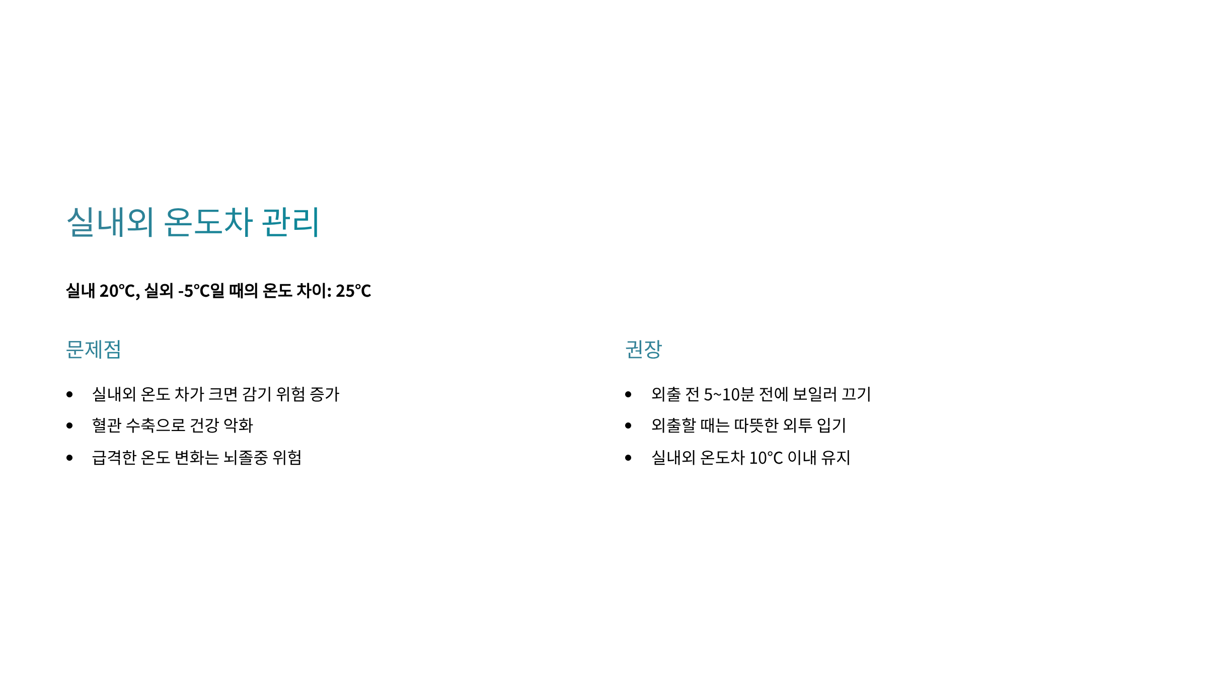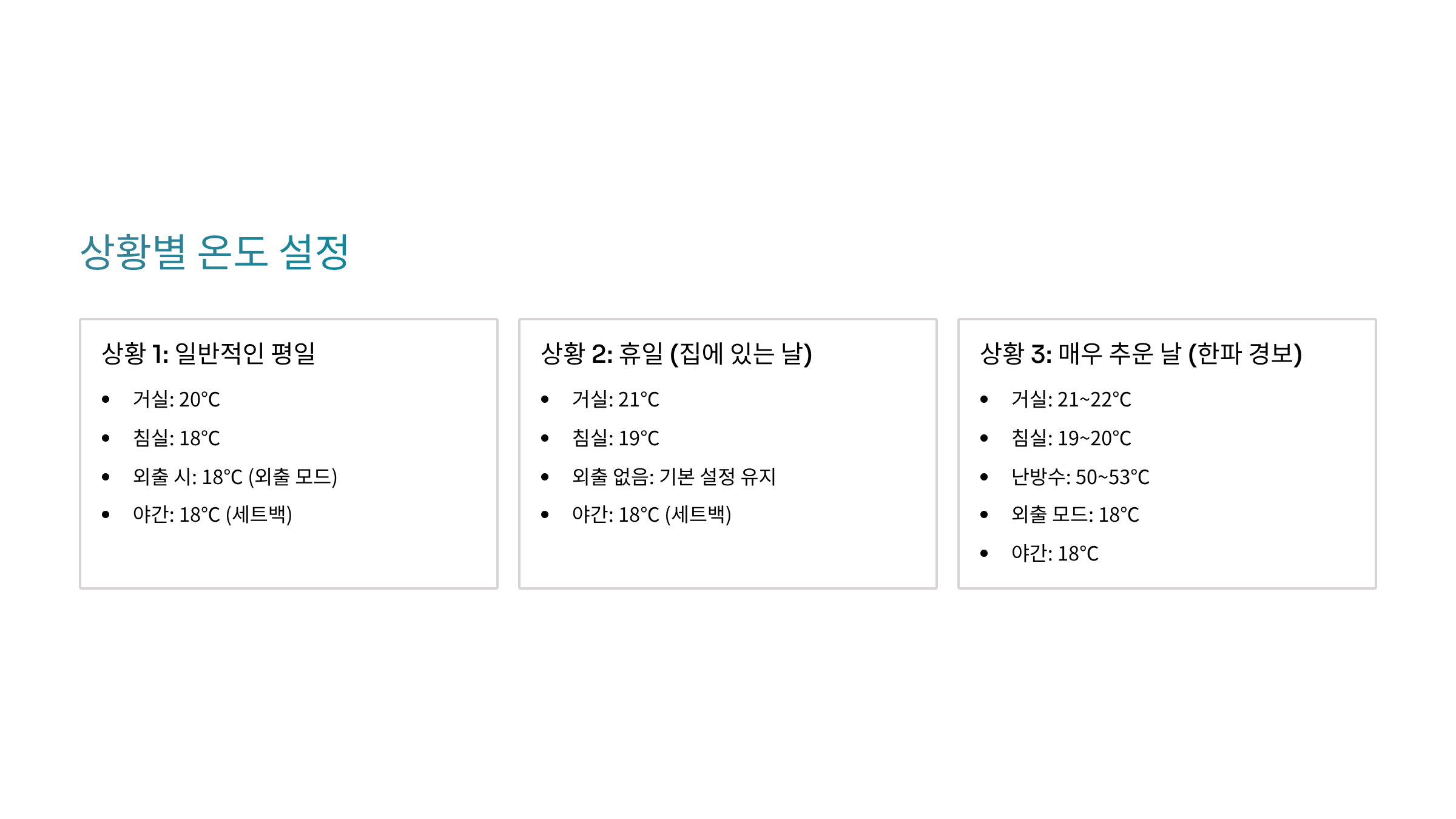 - 20℃에서 25℃로 올리면 = 난방비 35% 증가 (월 10만원 → 13.5만원)