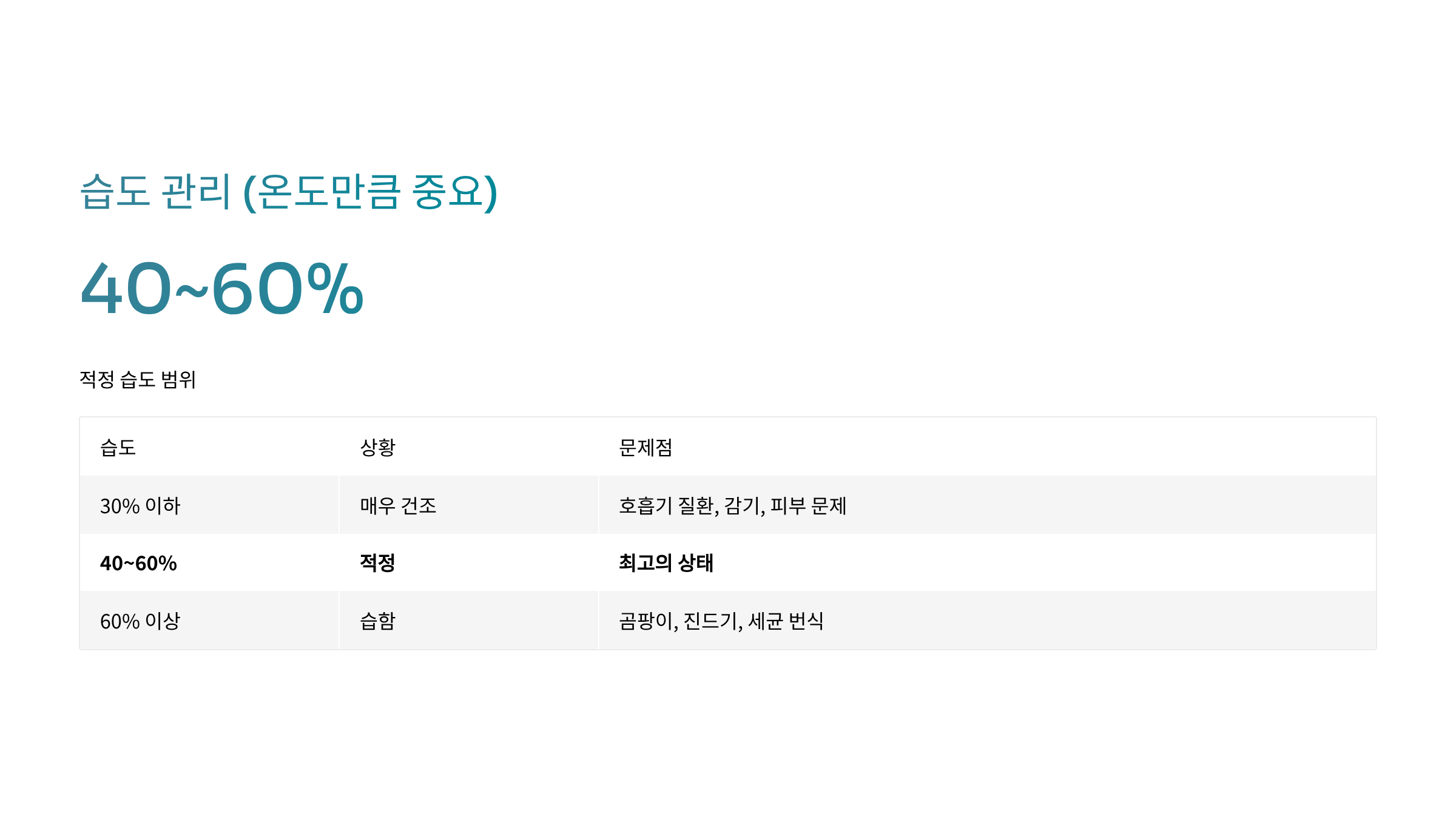 | 60% 이상 | 습함 | 곰팡이, 진드기, 세균 번식 |