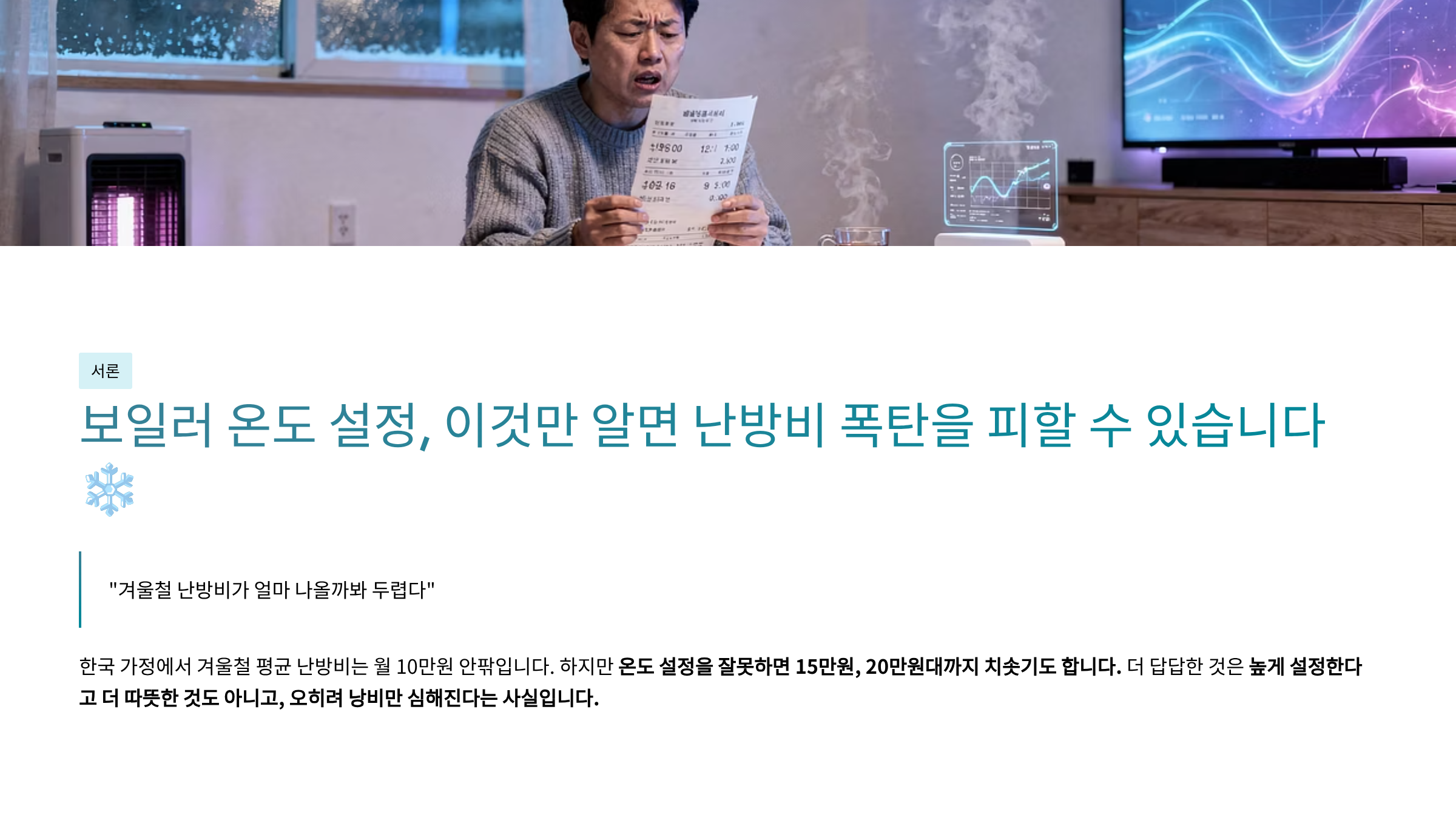 한국 가정에서 겨울철 평균 난방비는 월 10만원 안팎입니다. 하지만 온도 설정을 잘못하면 15만원, 20만원대까지 치솟기도 합니다. 더 답답한 것은 높게 설정한다고 더 따뜻한 것도 아니고, 오히려 낭비만 심해진다는 사실입니다.