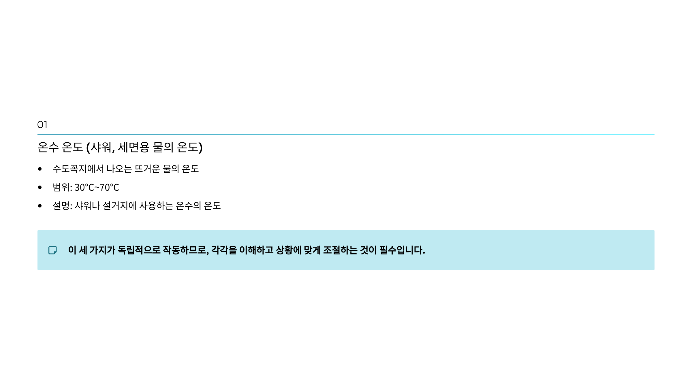 - 설명: 샤워나 설거지에 사용하는 온수의 온도