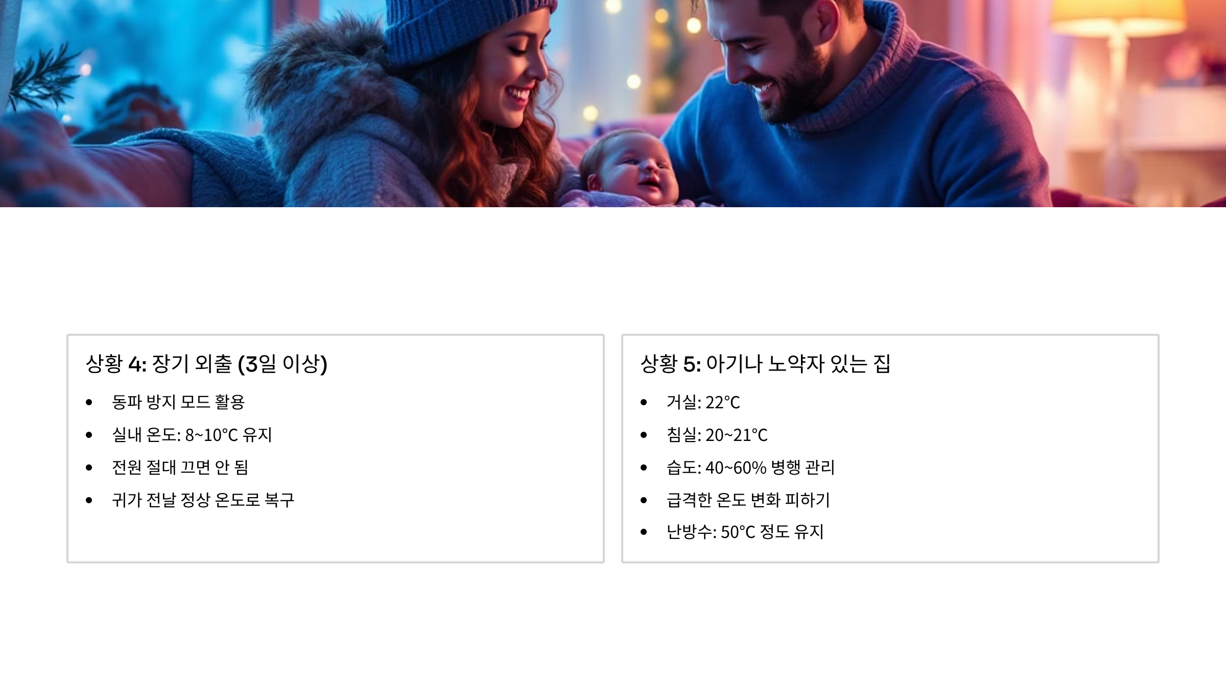 | 영유아·노약자 가정 | 20~24℃ | 면역력 약함, 온도 급변 피하기 위해 높게 설정 |