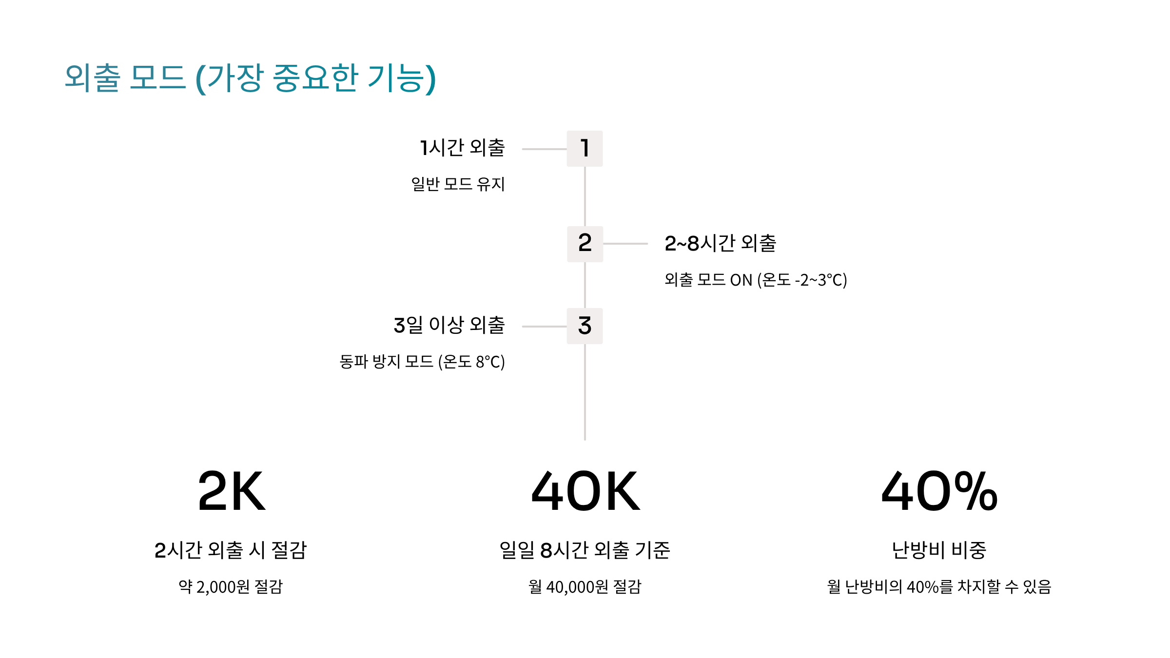 - 일일 8시간 외출 기준 월 40,000원 절감