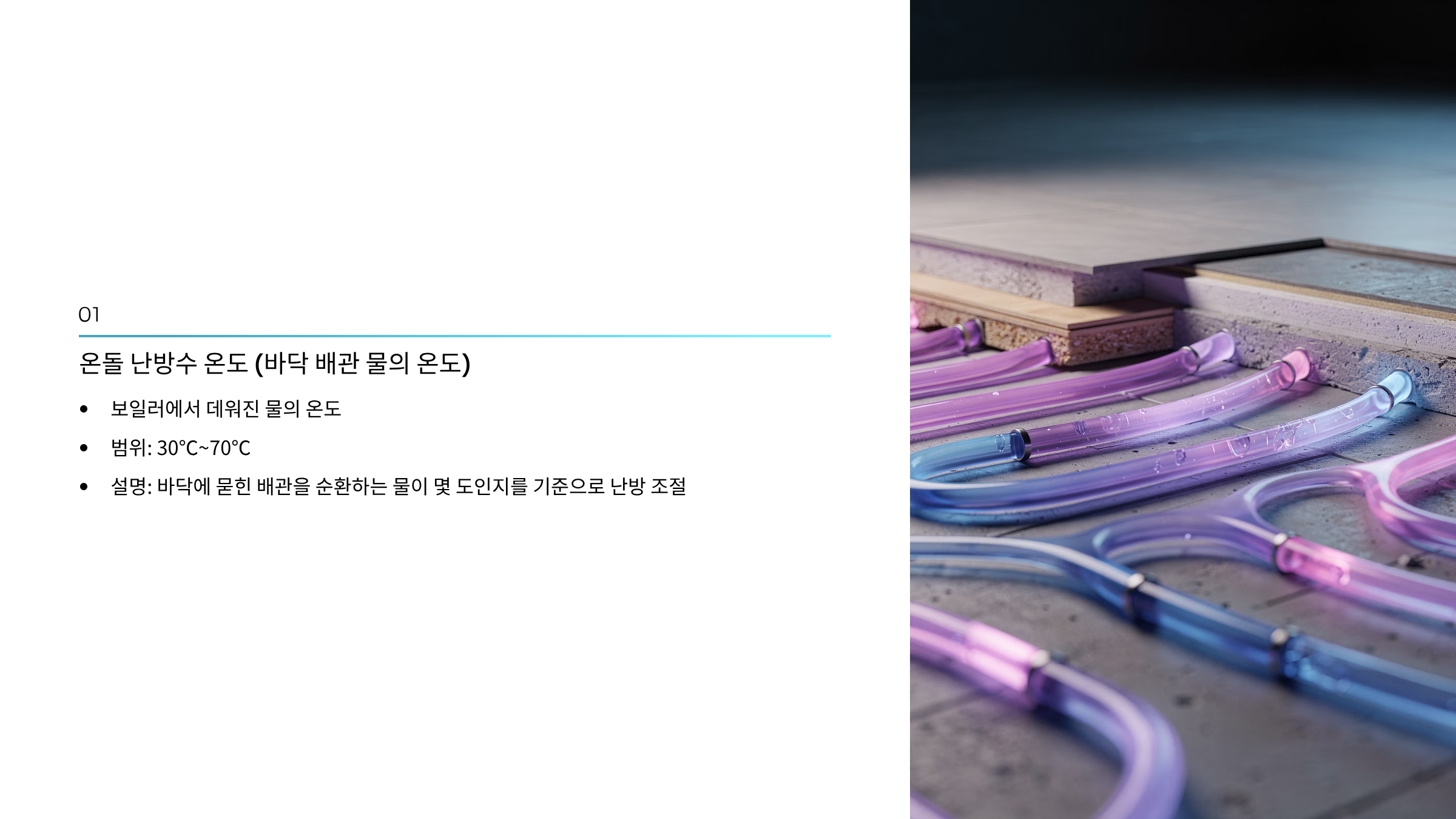 - 설명: 바닥에 묻힌 배관을 순환하는 물이 몇 도인지를 기준으로 난방 조절