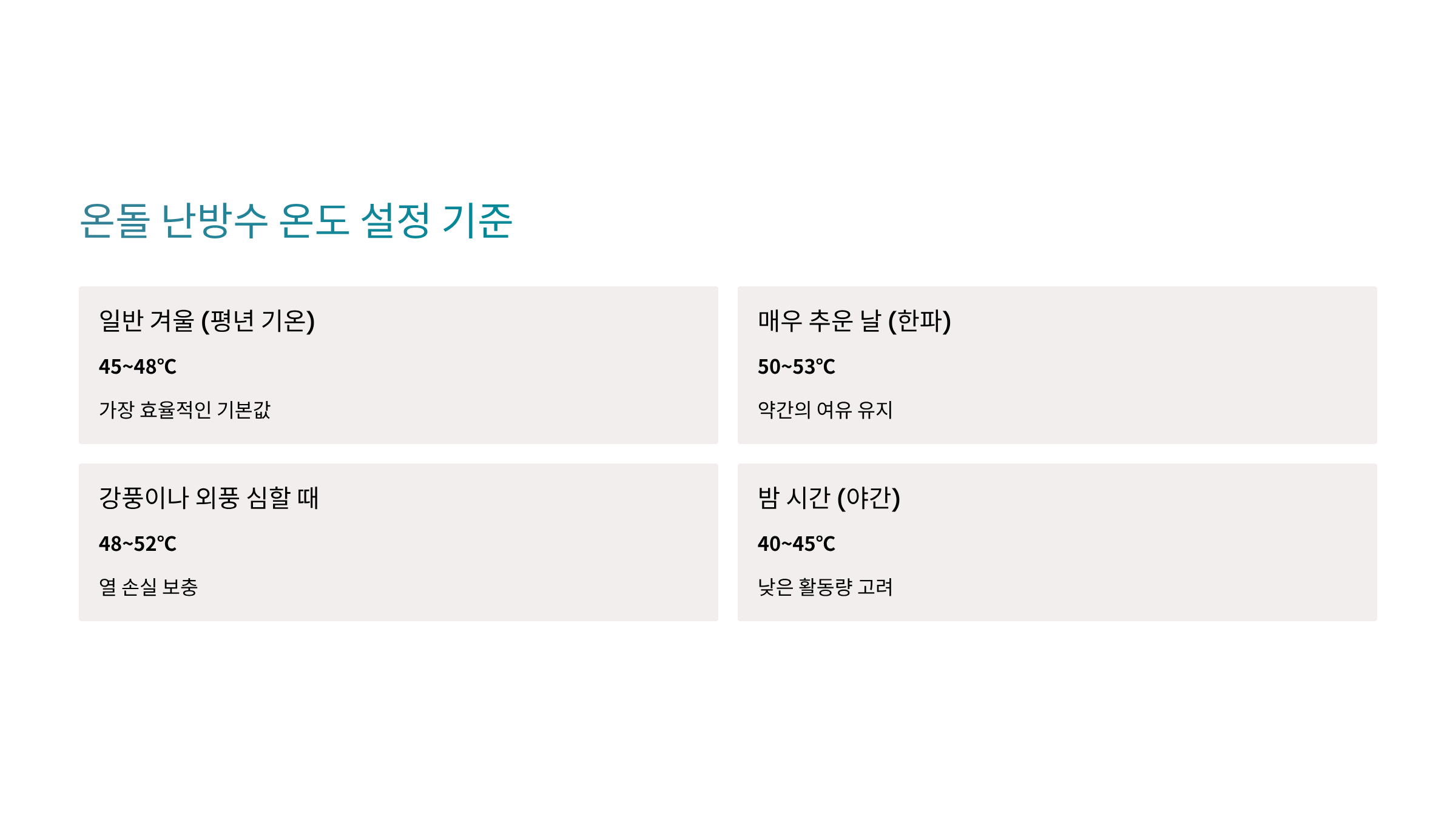 | 일반 겨울 (평년 기온) | 45~48℃ | 가장 효율적인 기본값 |