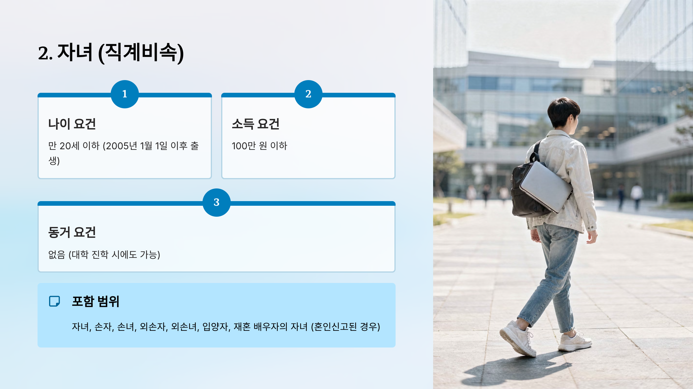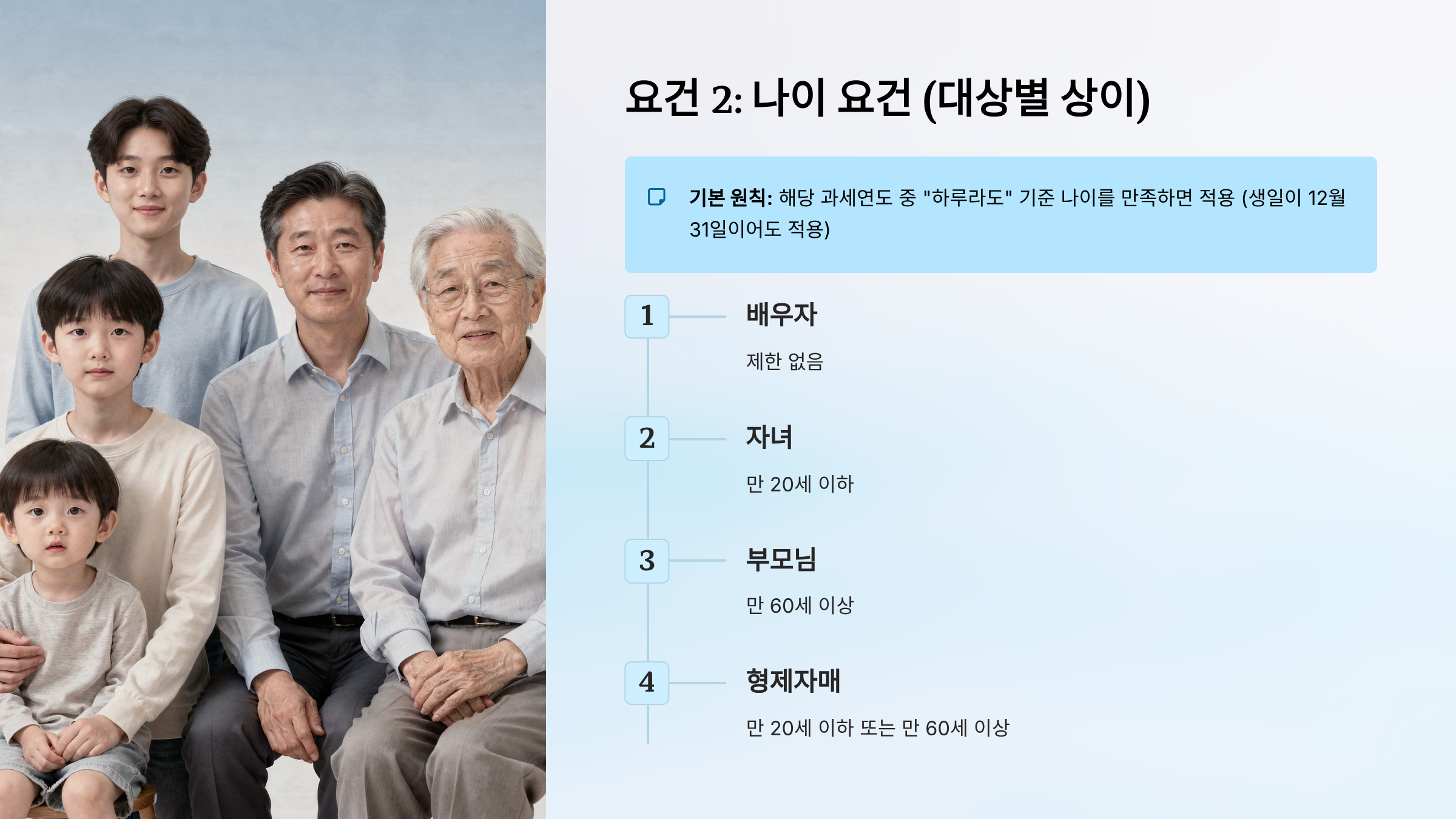 | 자녀 (직계비속) | 만 20세 이하 | 2005년 1월 1일 이후 출생 | 성인 자녀 제외 |