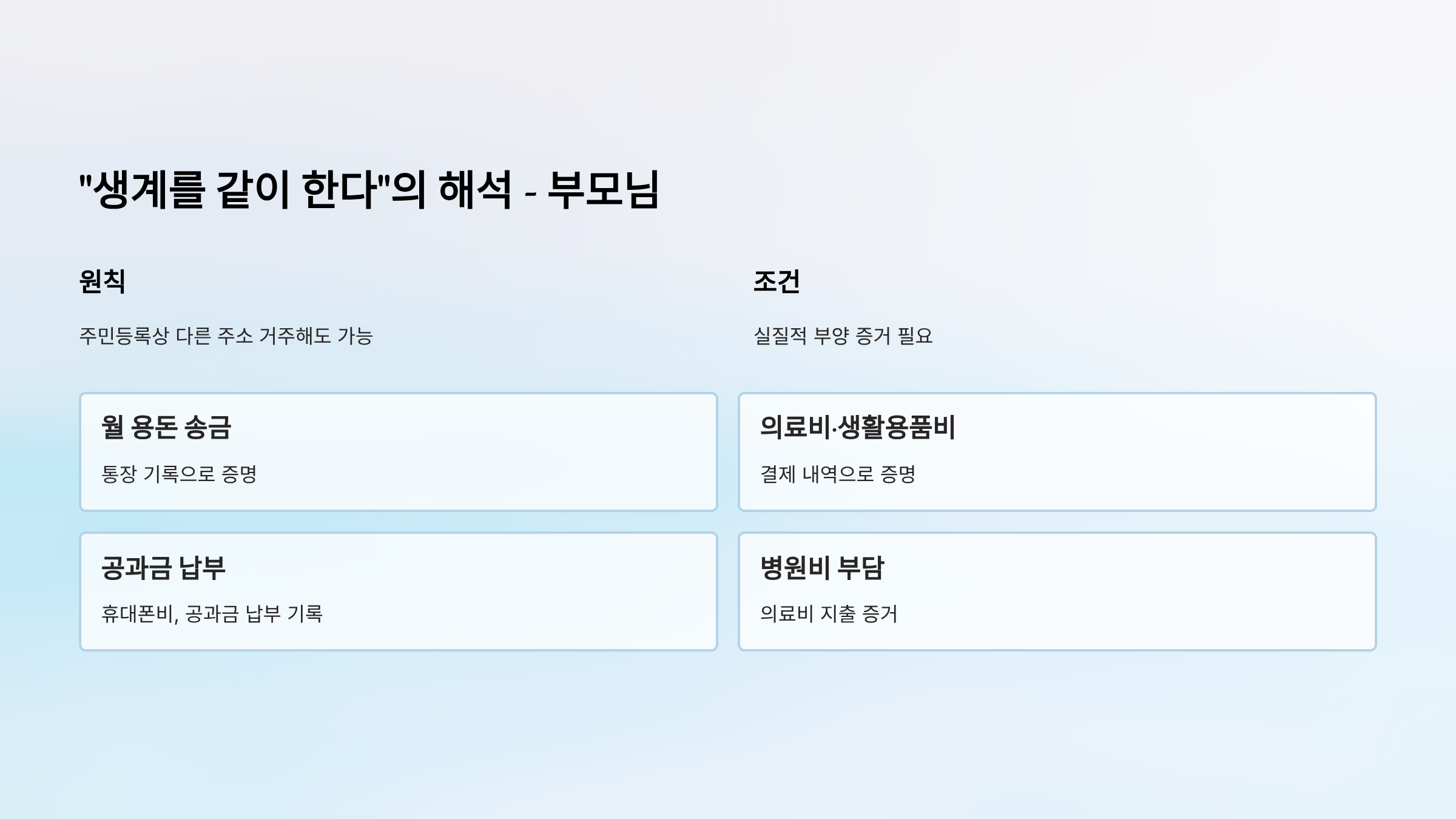 | 부모님 | 동거 또는 생활비 지원 | 떨어져 살아도 생활비 송금 등으로 부양 사실 증명 시 가능 | 통장 기록, 송금 증거 |