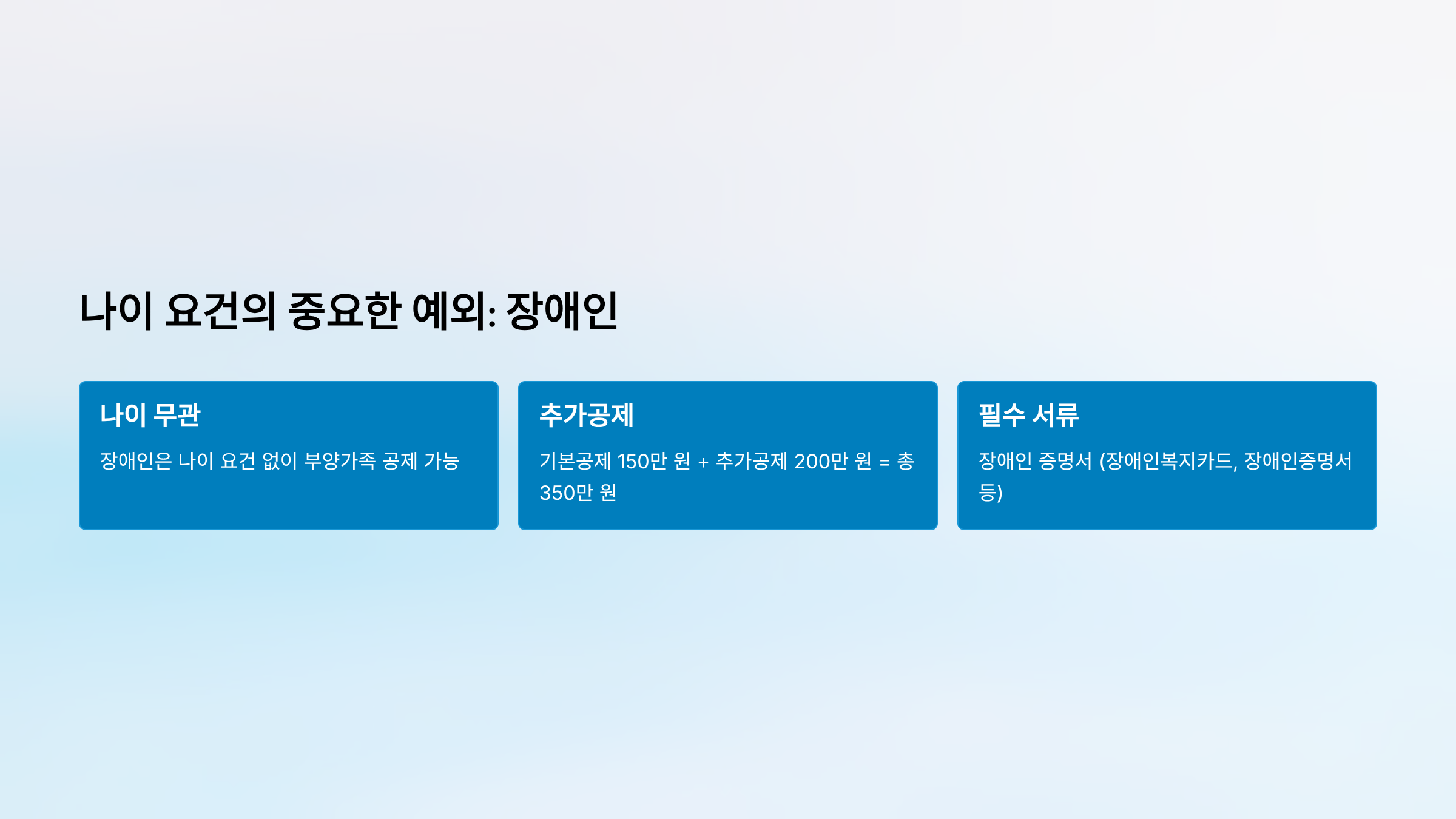 | 장애인 | 제한 없음 | - | 나이 무관 (장애인 증명서 필요) |
