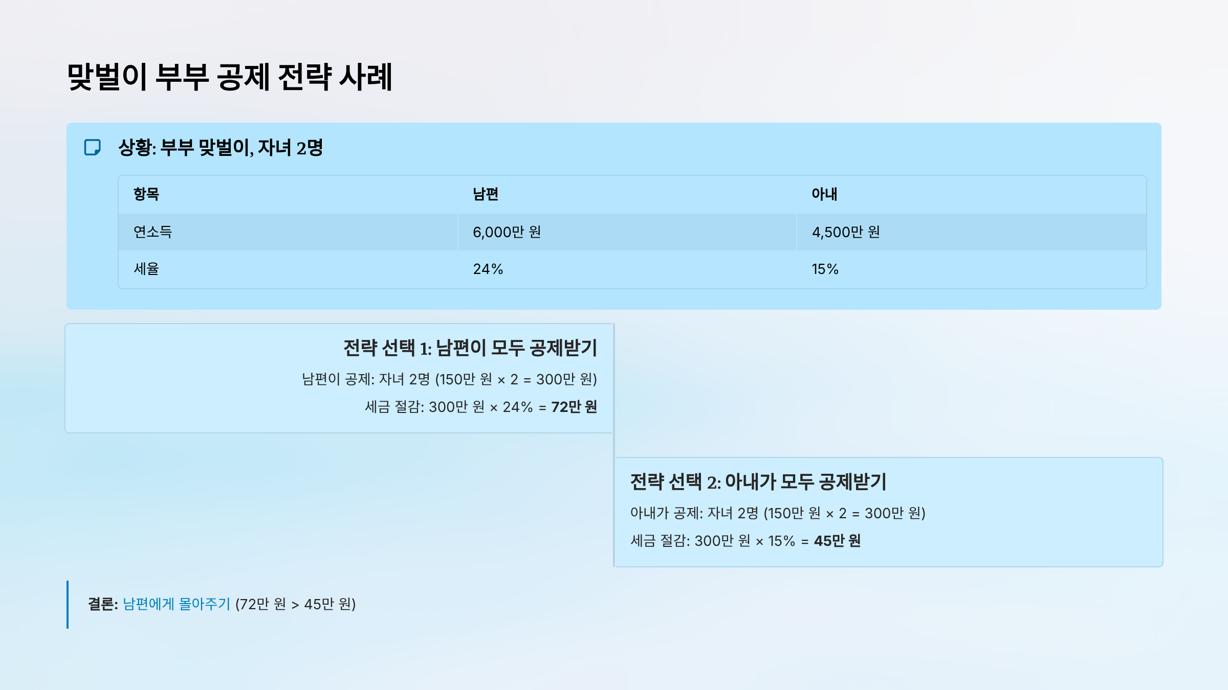 결론: 남편에게 몰아주기 (72만 원 > 45만 원)