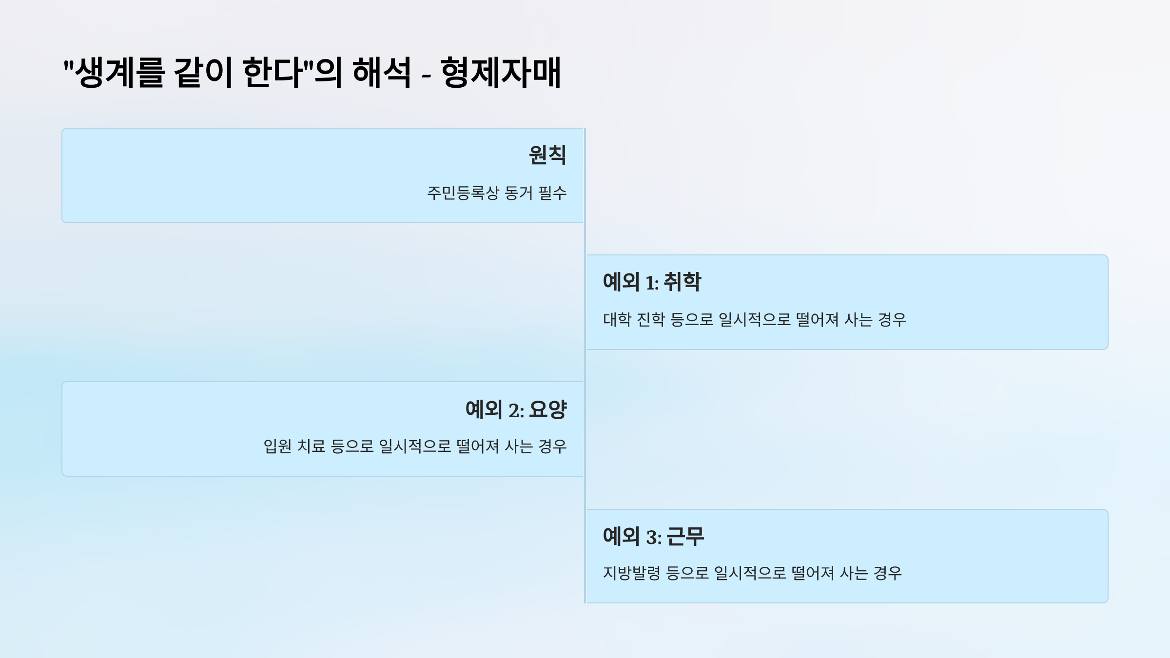 - 예외: 취학(대학 진학), 요양(입원 치료), 근무(지방발령) 등 일시적 사유