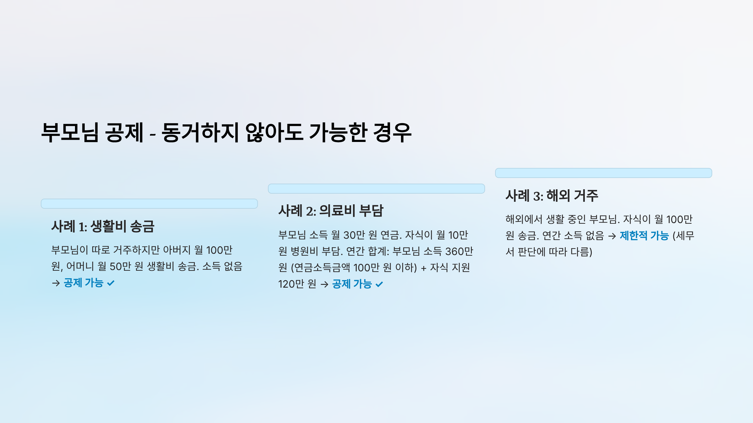 - 배우자·자녀는 동거 불필요, 부모는 실질적 부양 증명 필요