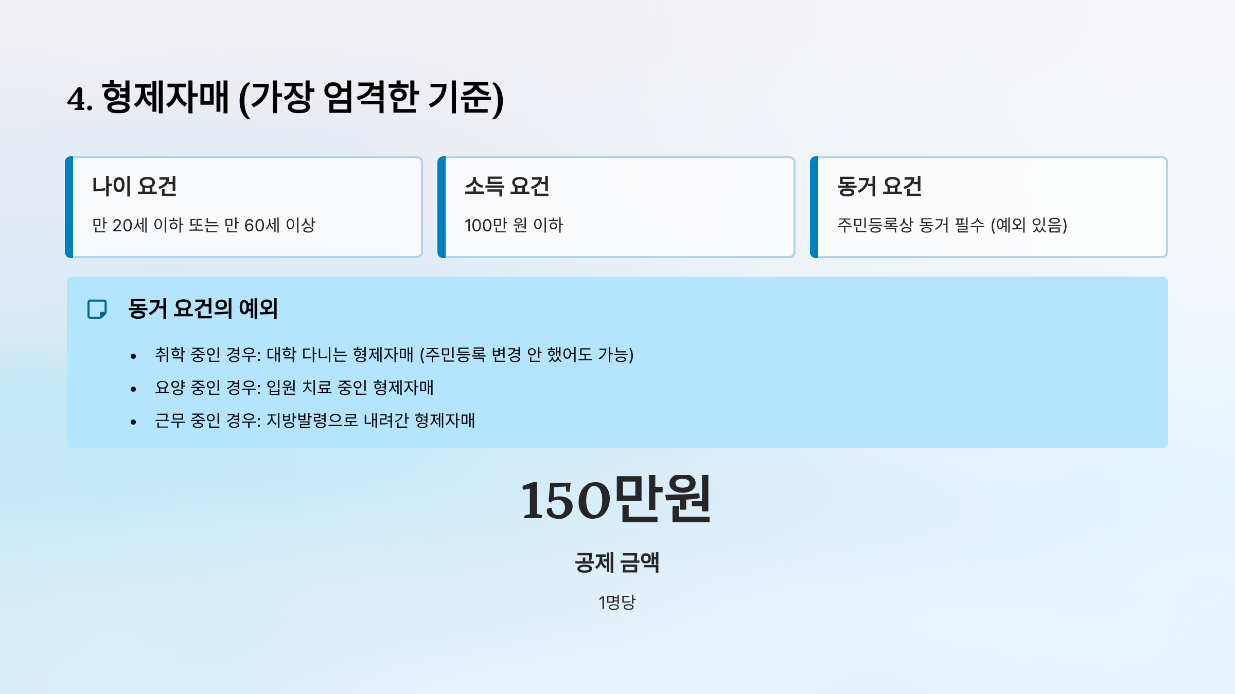- 동거 요건: 주민등록상 동거 필수 (예외 있음)
