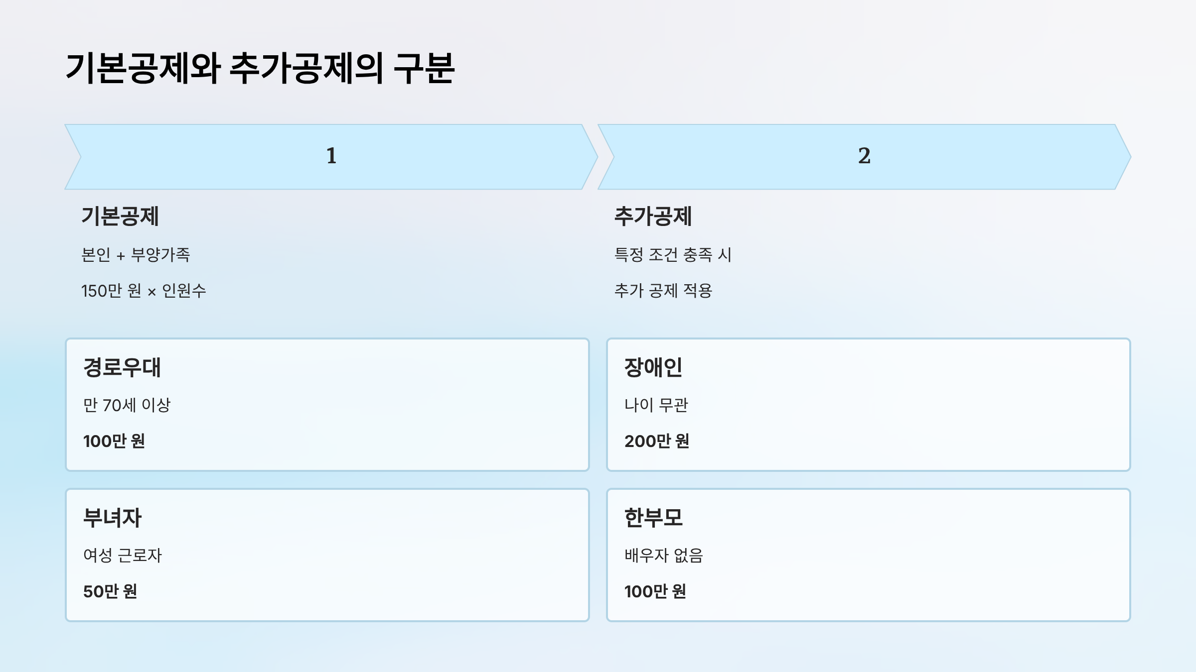 - 추가공제: 200만 원 (기본공제 150만 원 + 추가공제 200만 원 = 총 350만 원)