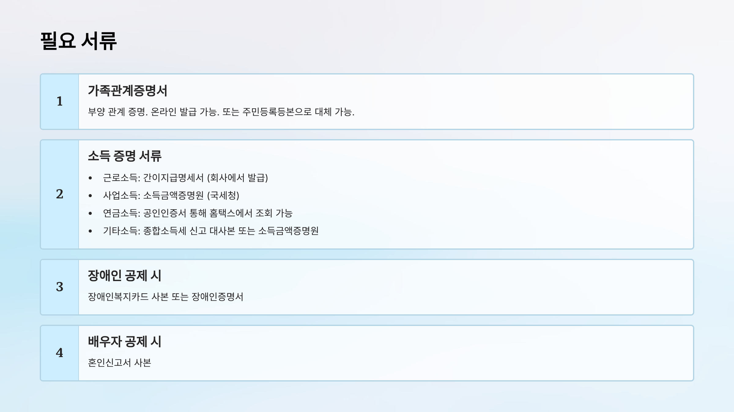 - 필수 서류: 장애인 증명서 (장애인복지카드, 장애인증명서 등)