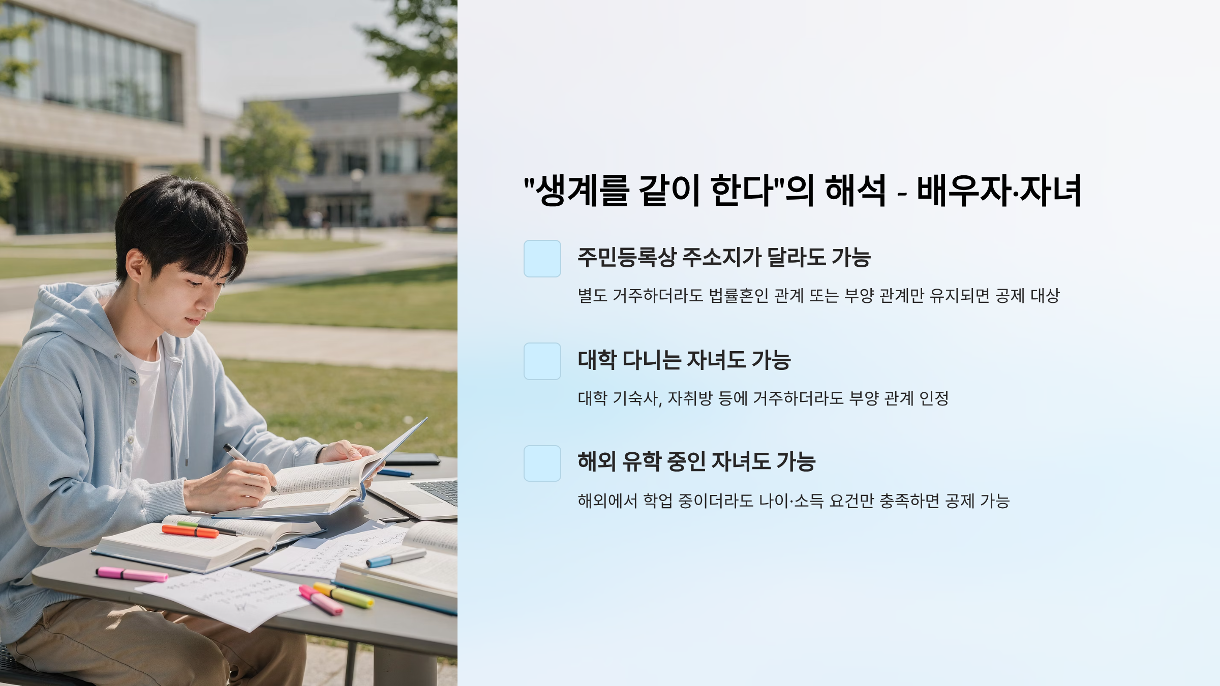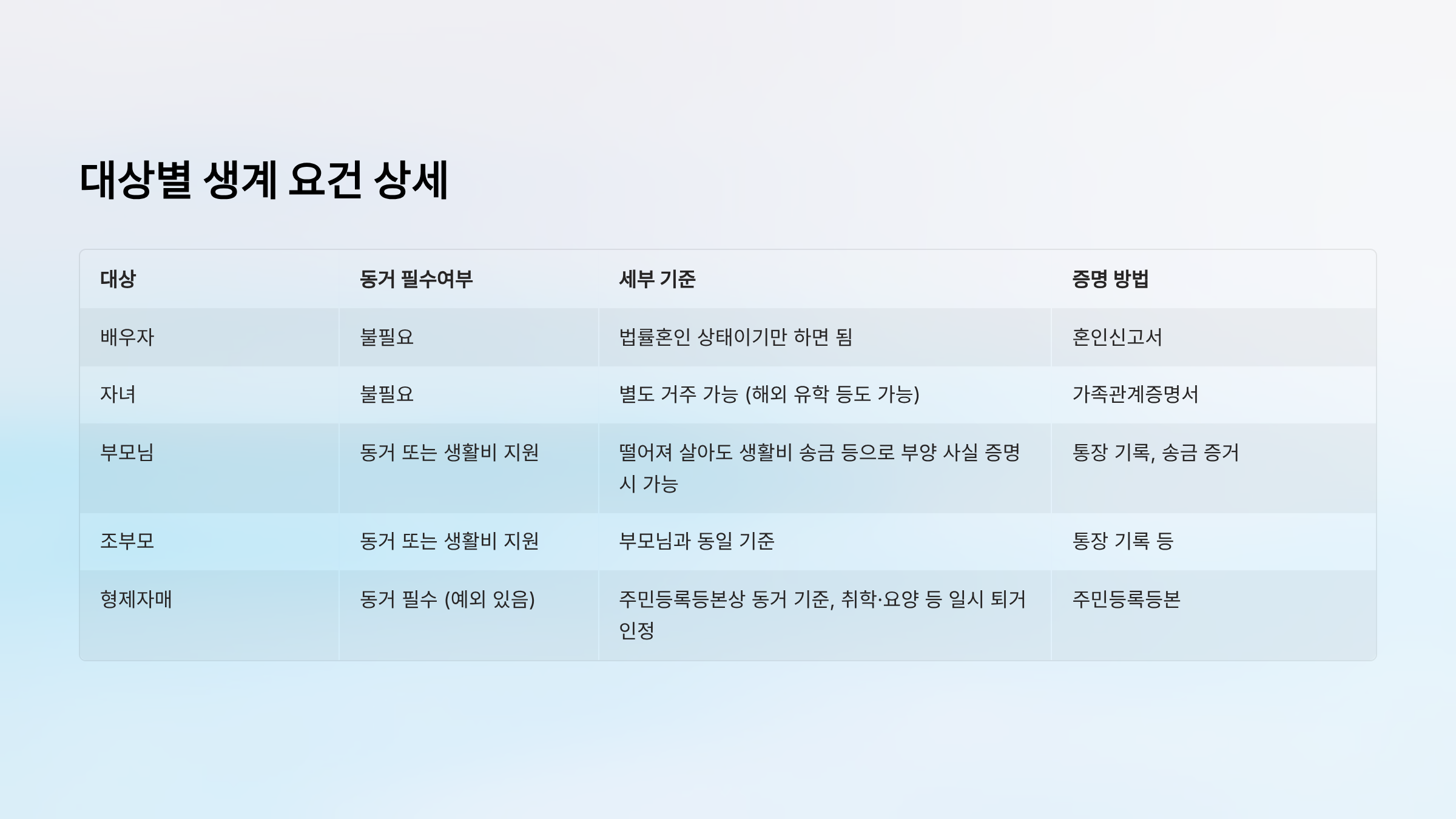 - 동거 요건: 없음 (별도 거주 가능)