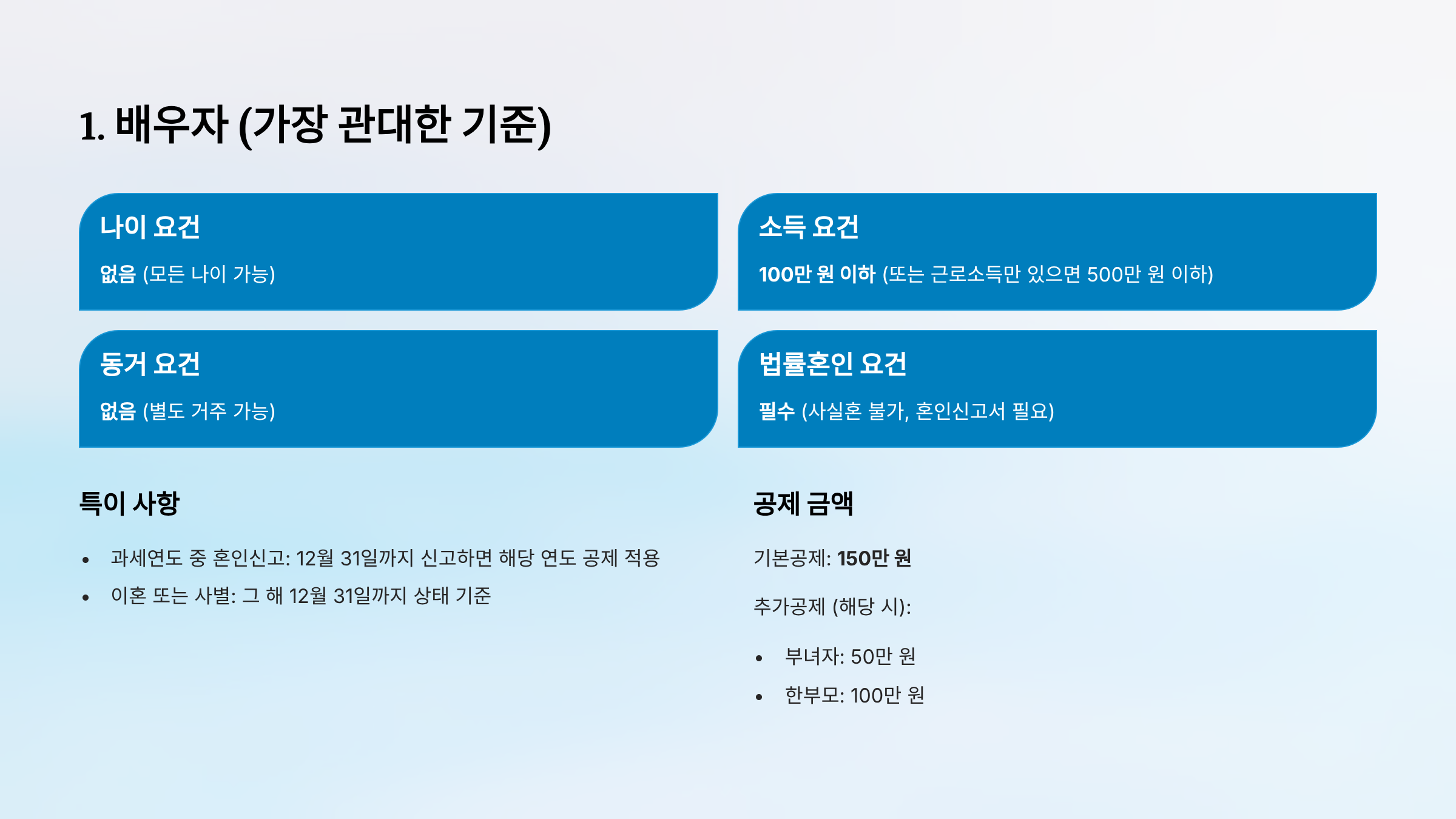 - 이혼 또는 사별: 그 해 12월 31일까지 상태 기준