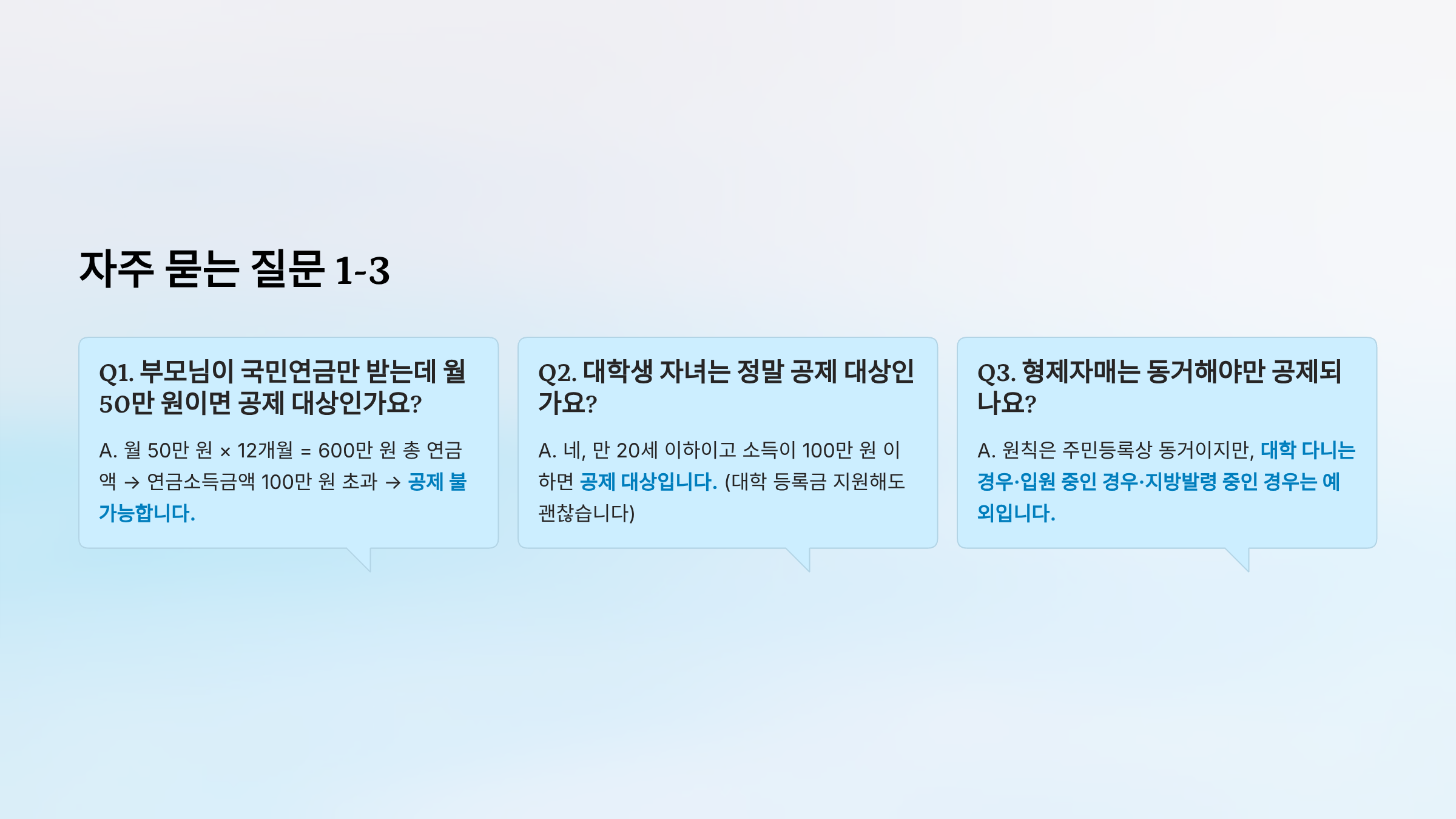 Q1. 부모님이 국민연금만 받는데 월 50만 원이면 공제 대상인가요?