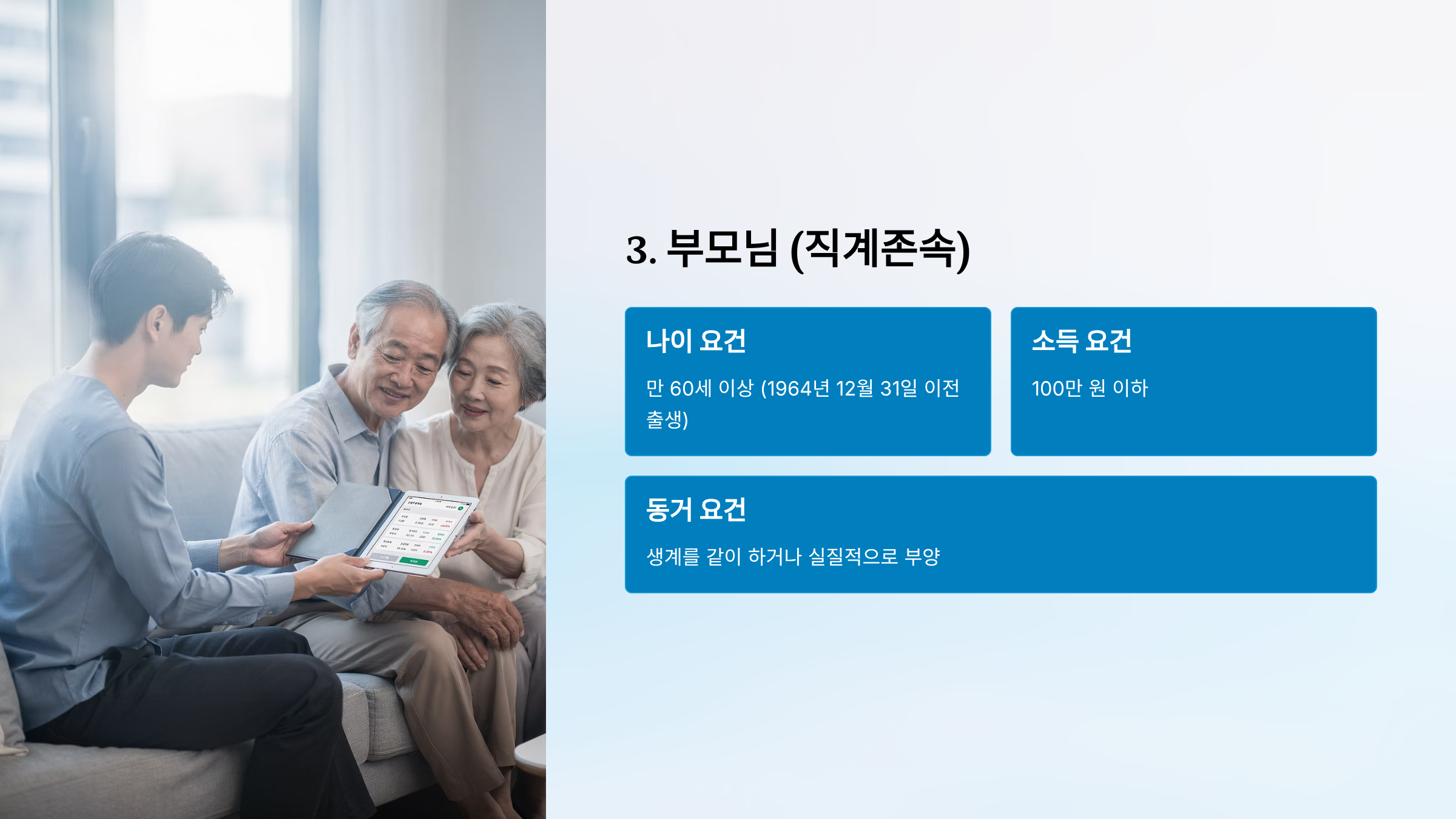 | 부모님 (직계존속) | 만 60세 이상 | 1964년 12월 31일 이전 출생 | 59세 11개월은 불가 |