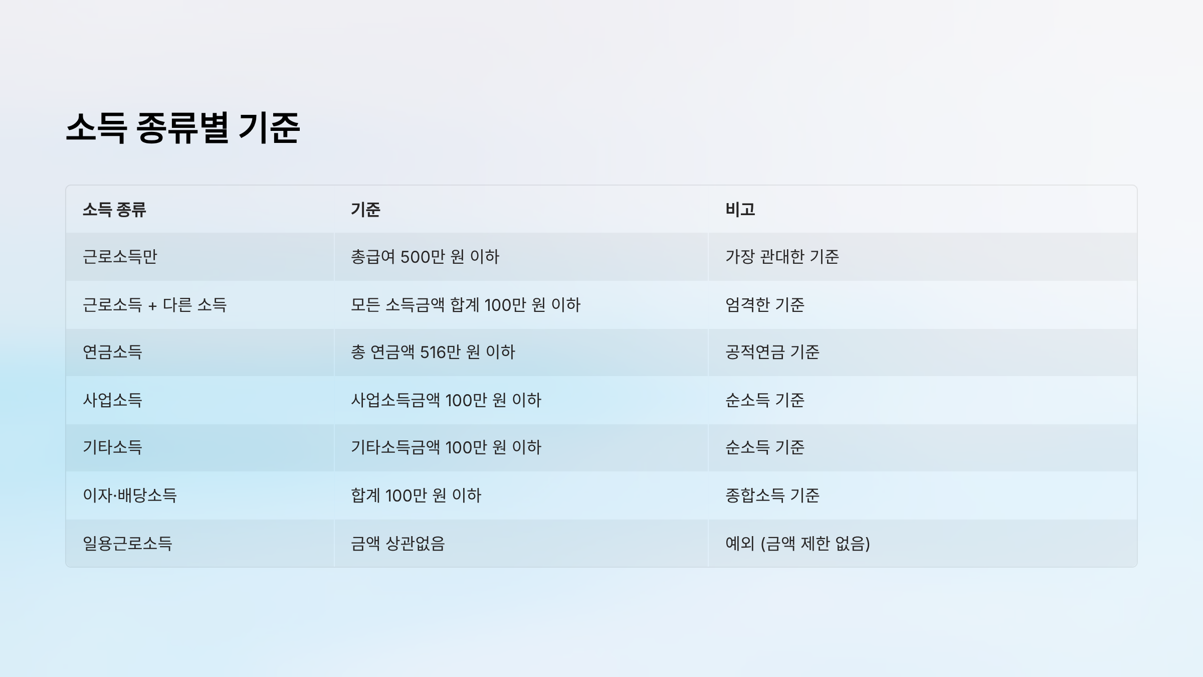 | 근로소득 + 다른 소득 | 모든 소득금액 합계 100만 원 이하 | 엄격한 기준 |