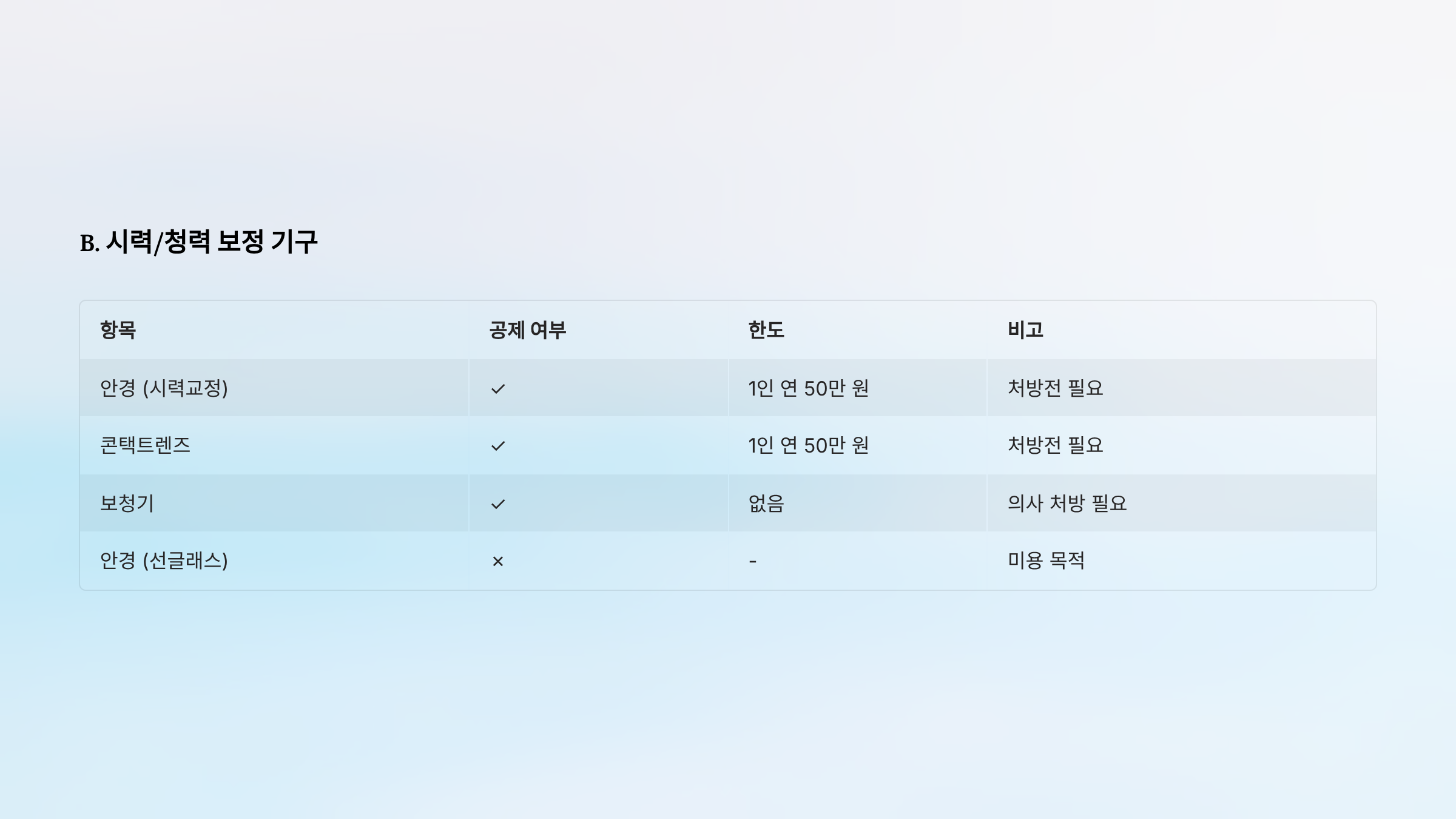 | 안경 (시력교정) | ✓ | 1인 연 50만 원 | 처방전 필요 |