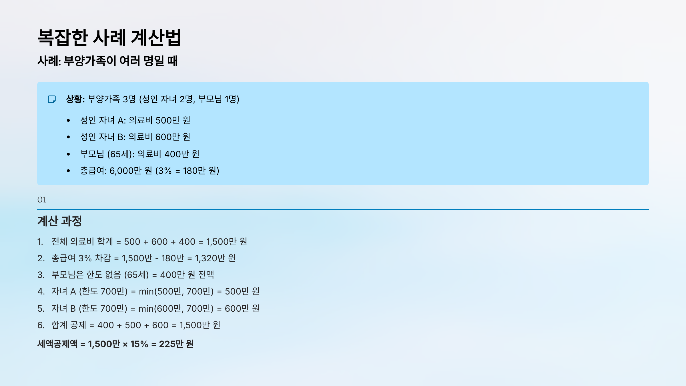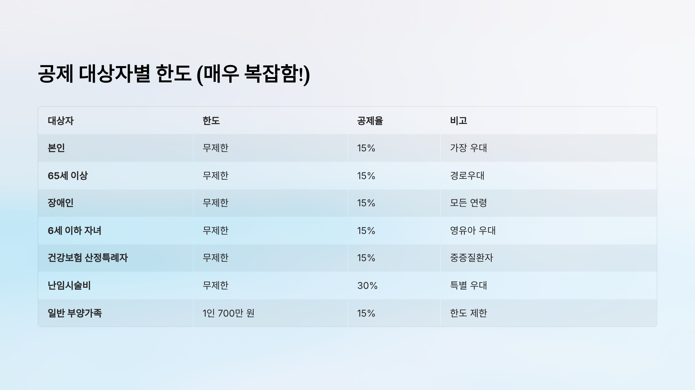 | 일반 부양가족 | 1인 700만 원 | 15% | 한도 제한 |