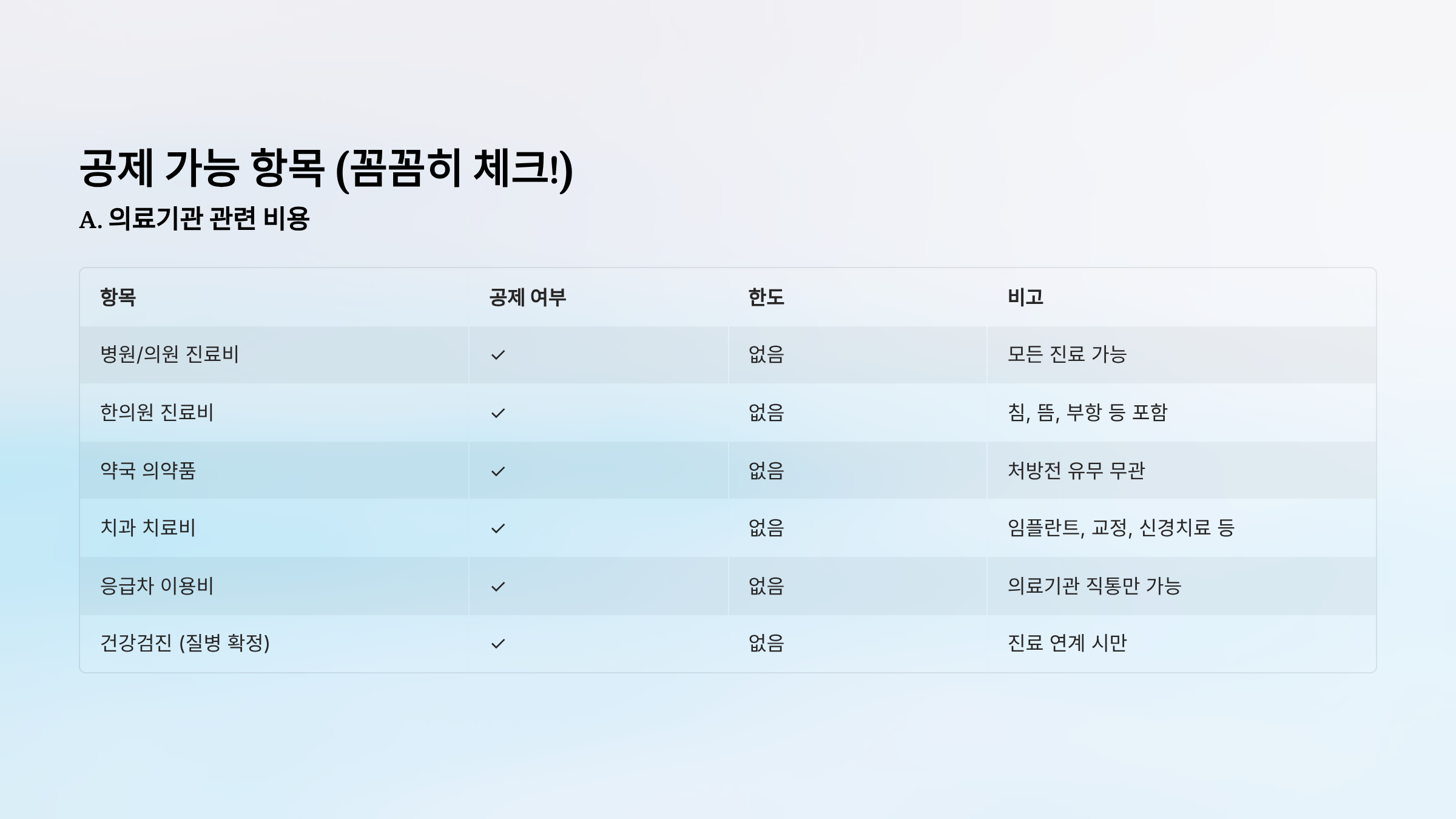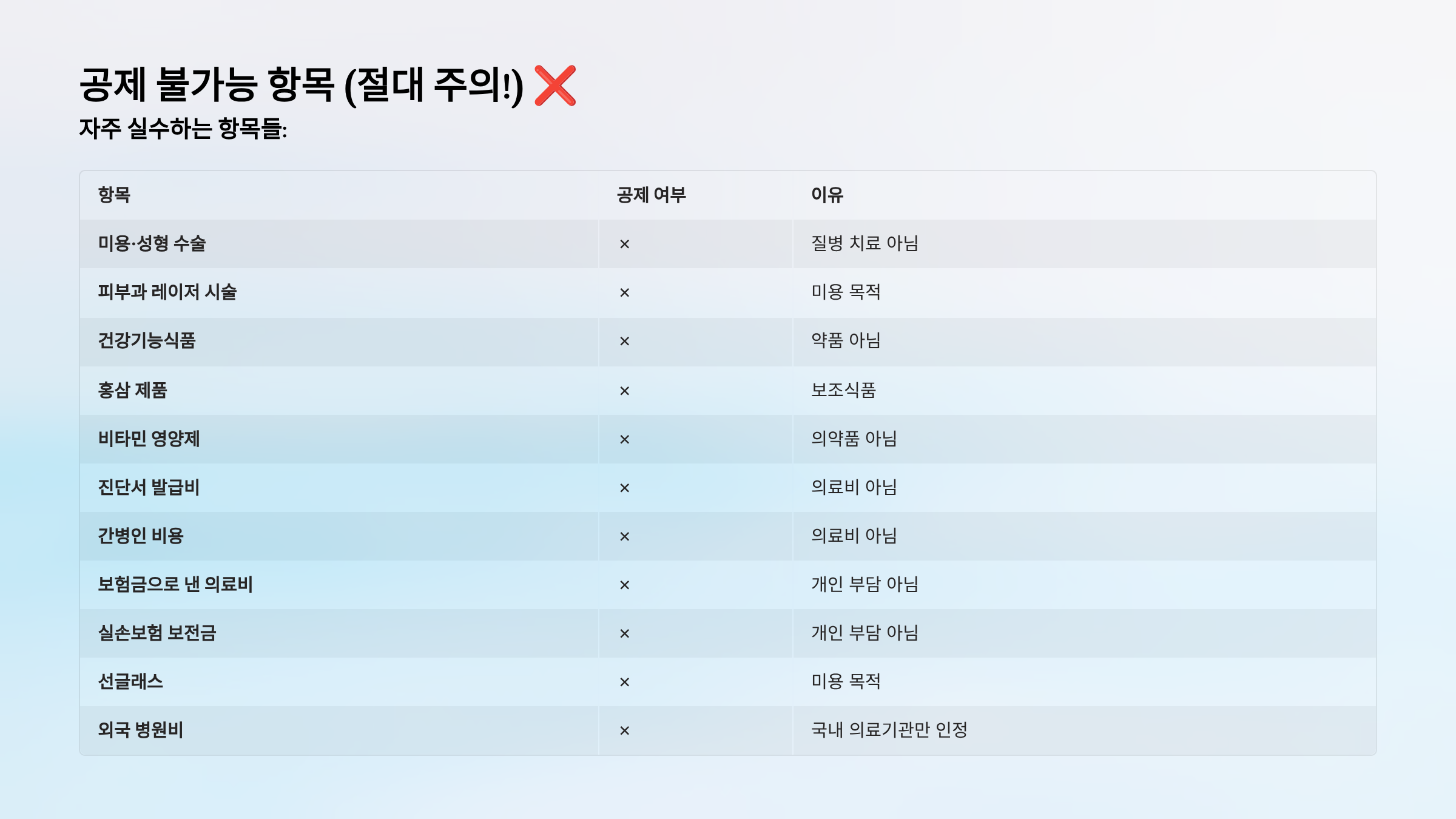 - 공제 불가 항목: 보험금 지원분, 미용·성형, 건강기능식품, 진단서 발급비
