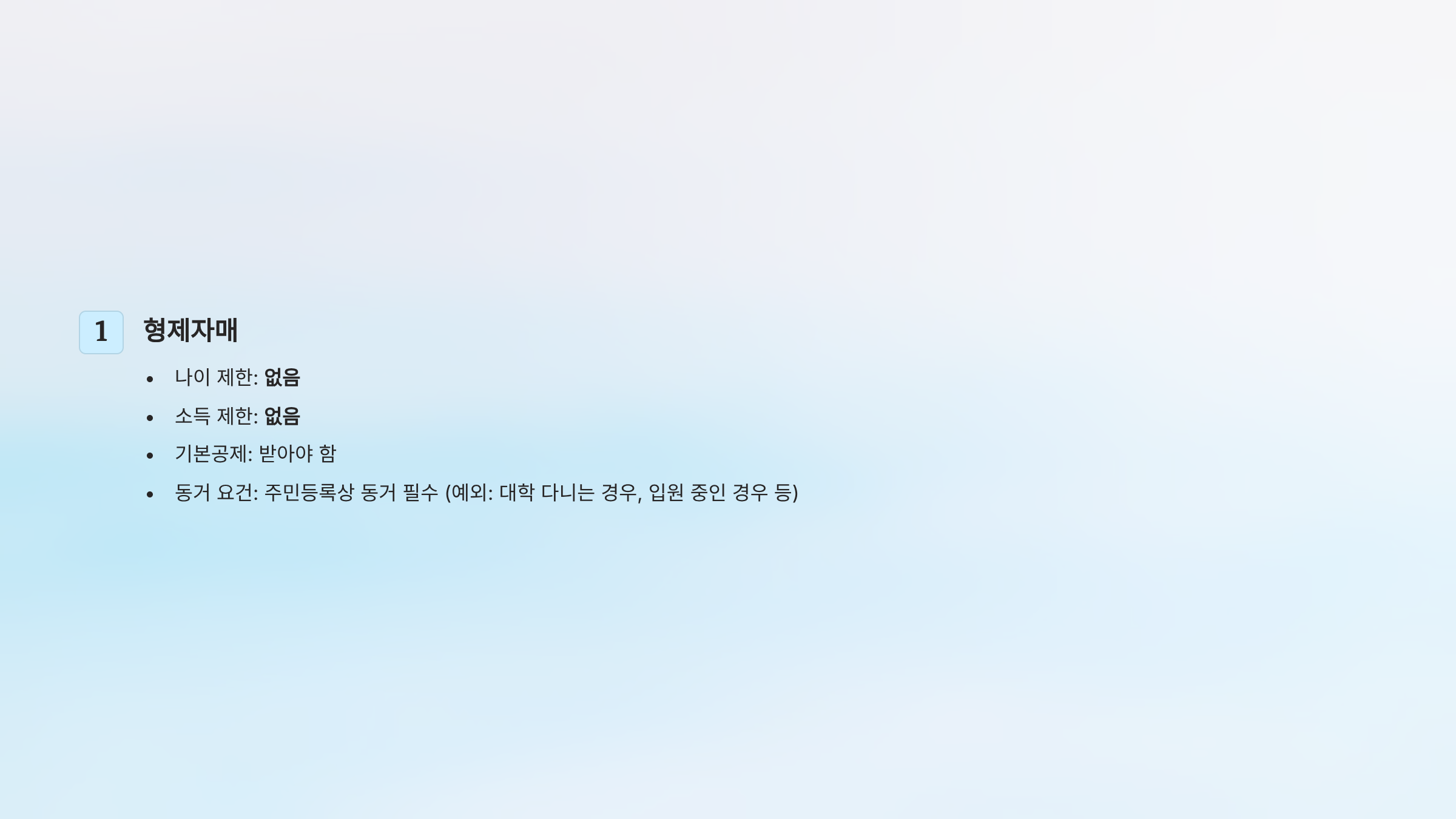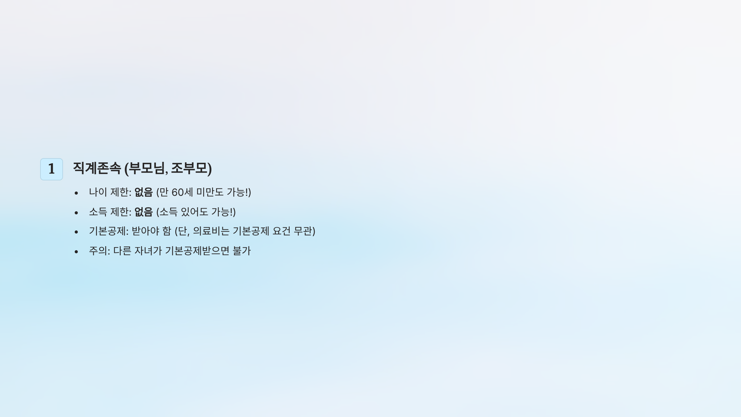- 동거 요건: 주민등록상 동거 필수 (예외: 대학 다니는 경우, 입원 중인 경우 등)