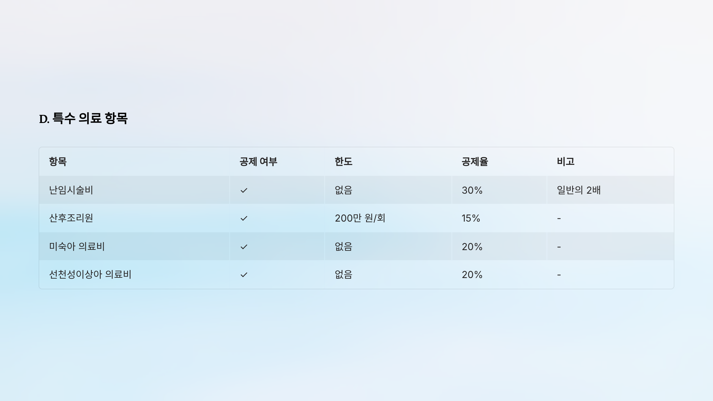 | 치과 치료비 | ✓ | 없음 | 임플란트, 교정, 신경치료 등 |