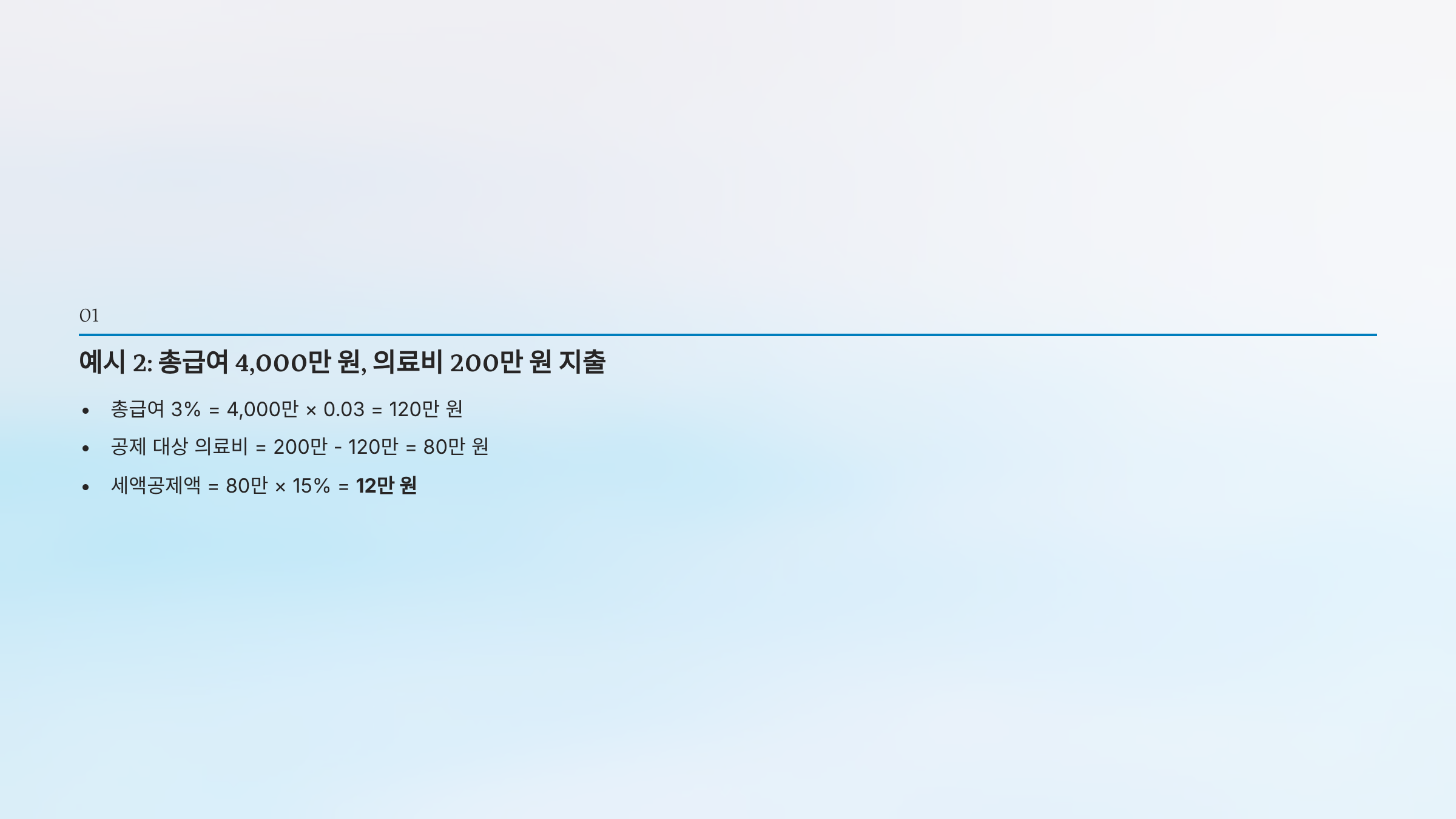 예시 1: 총급여 5,000만 원, 의료비 300만 원 지출