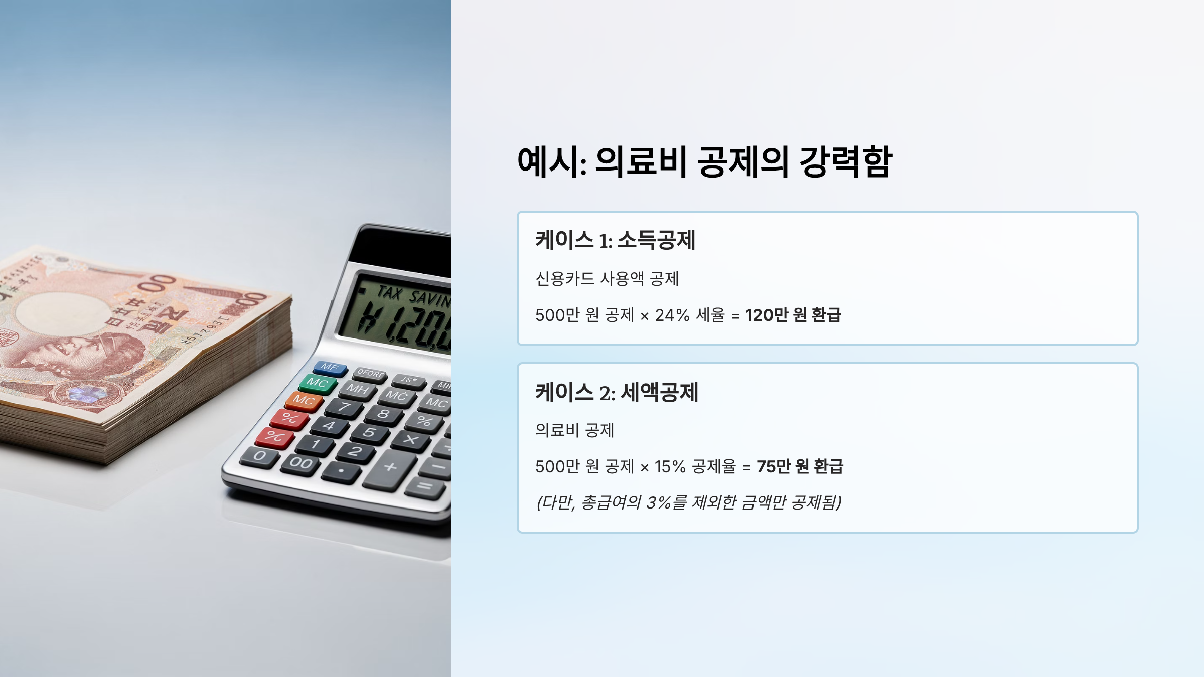 - 세액공제: 세금에서 직접 차감 (절감액이 더 큼) ← 의료비는 세액공제!