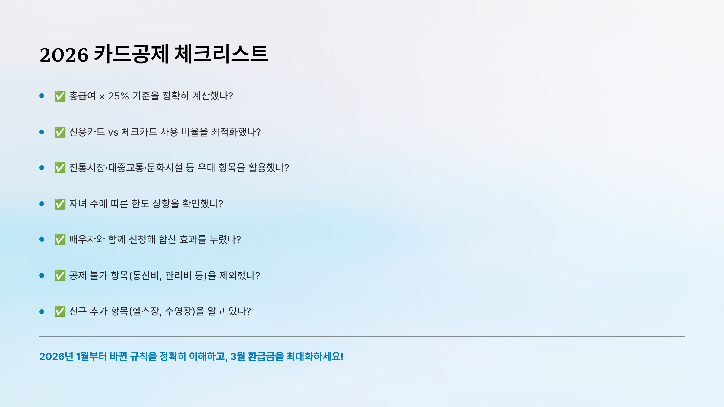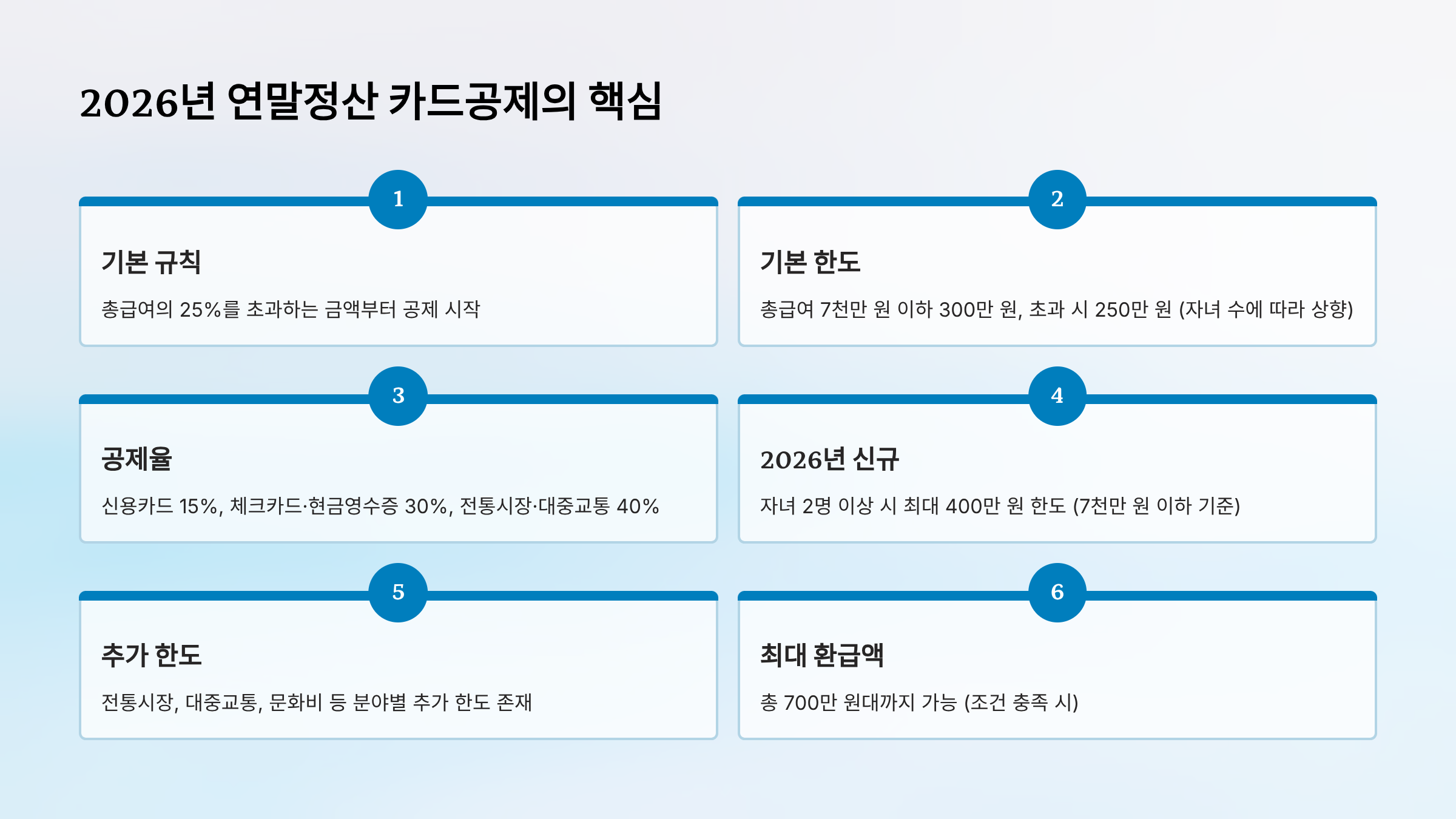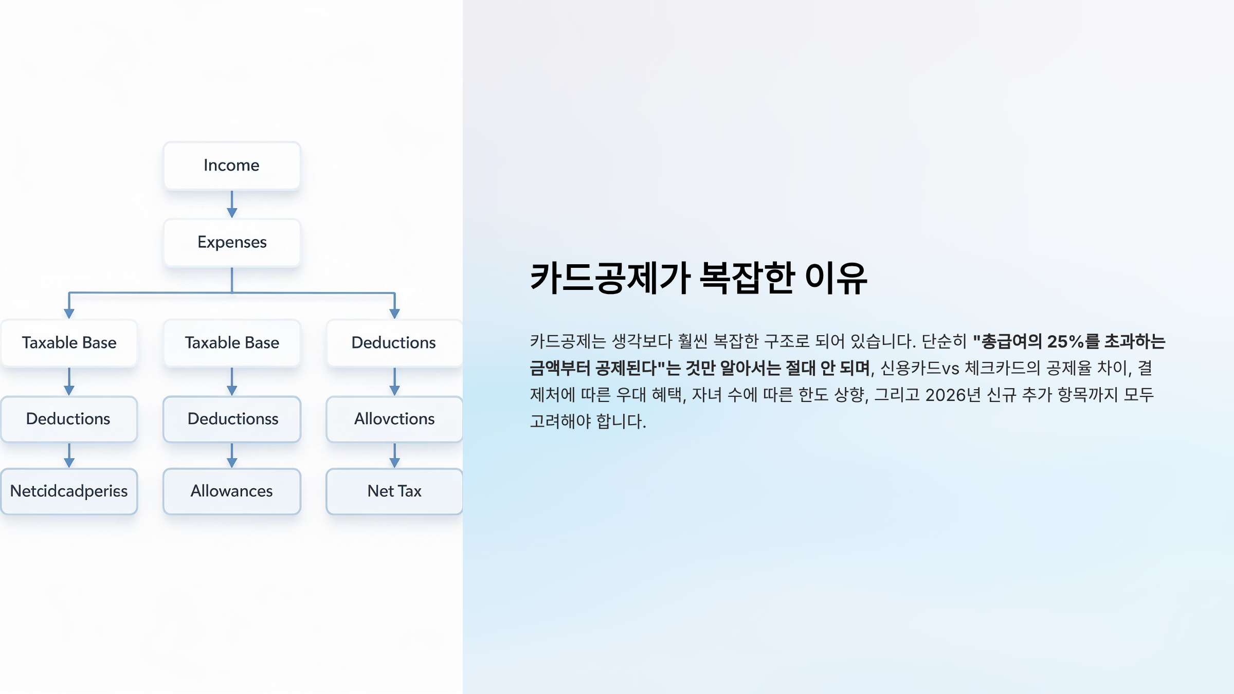 그 이유는 카드공제가 생각보다 훨씬 복잡한 구조로 되어 있기 때문입니다. 단순히 "총급여의 25%를 초과하는 금액부터 공제된다"는 것만 알아서는 절대 안 되며, 신용카드vs 체크카드의 공제율 차이, 결제처에 따른 우대 혜택, 자녀 수에 따른 한도 상향, 그리고 2026년 신규 추가 항목까지 모두 고려해야 합니다.