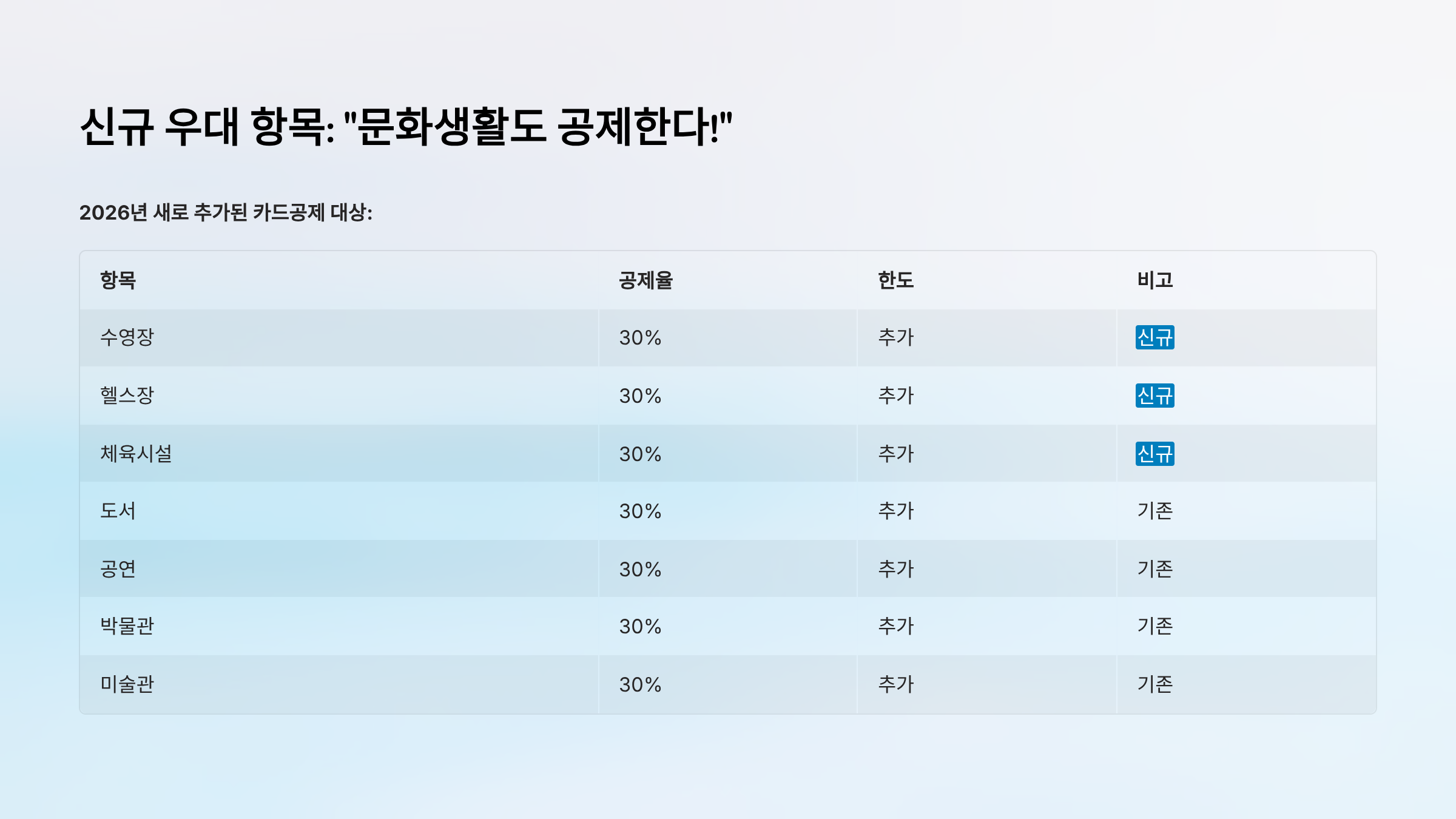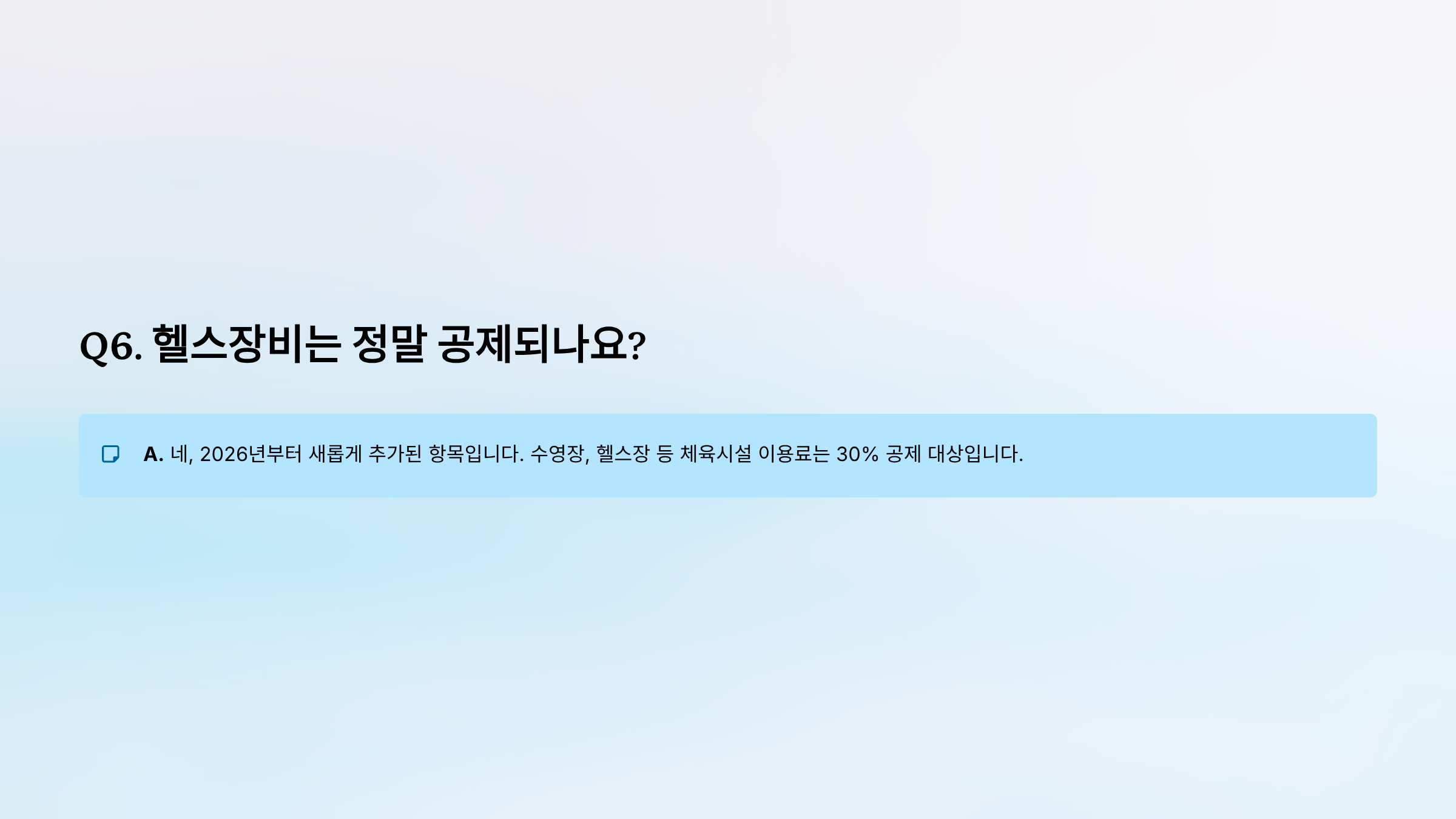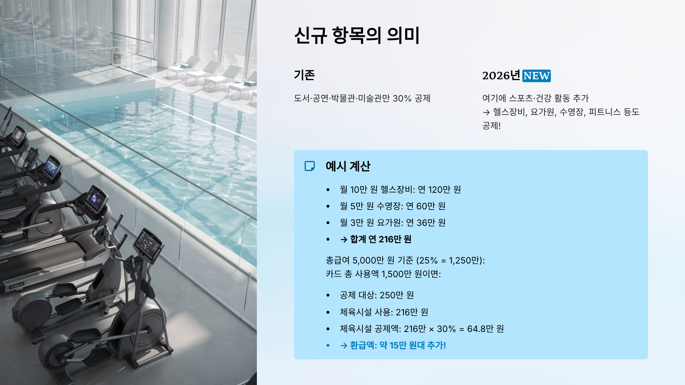 A. 네, 2026년부터 새롭게 추가된 항목입니다. 수영장, 헬스장 등 체육시설 이용료는 30% 공제 대상입니다.