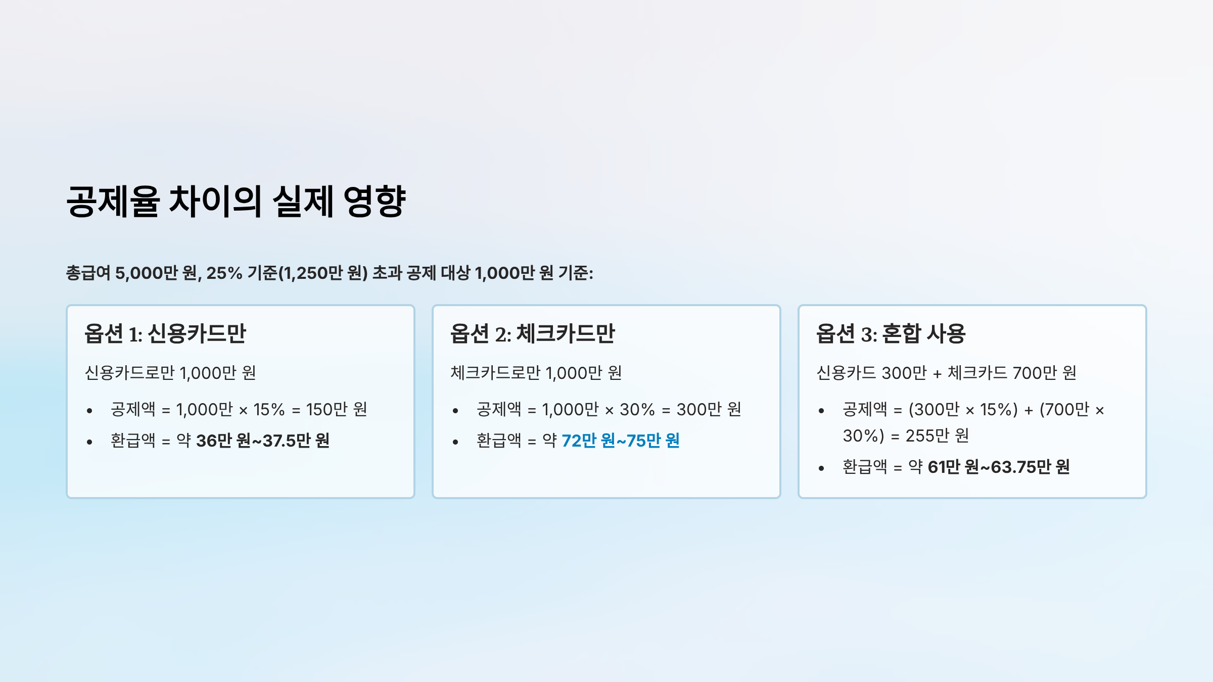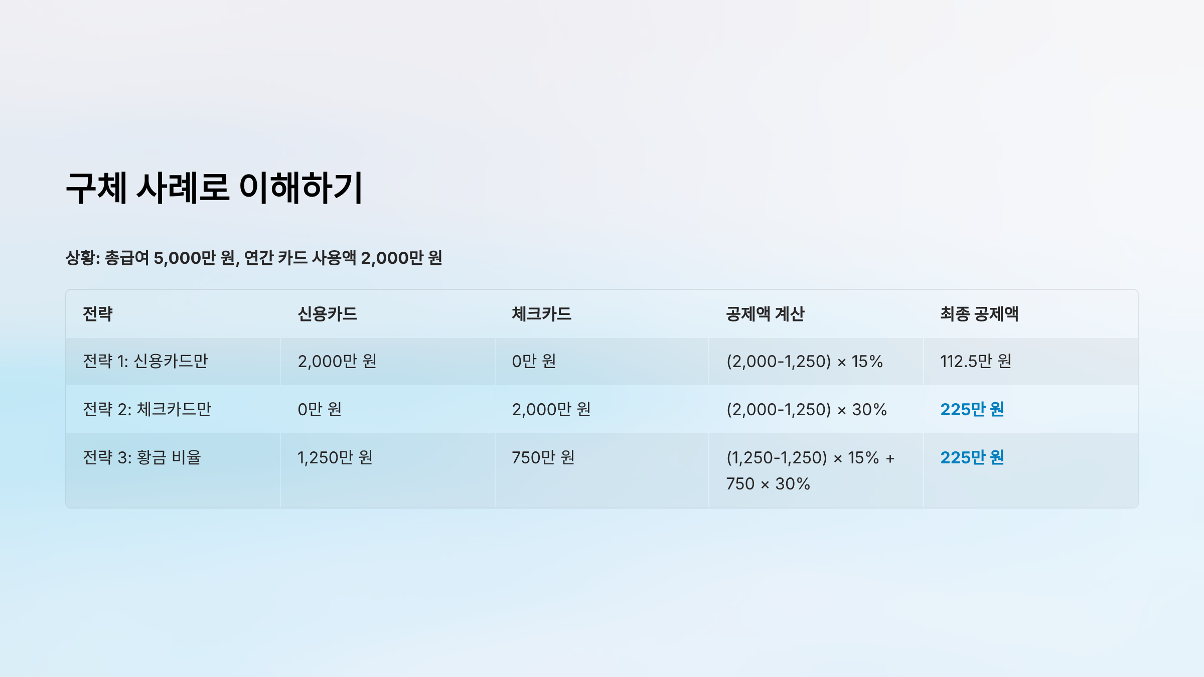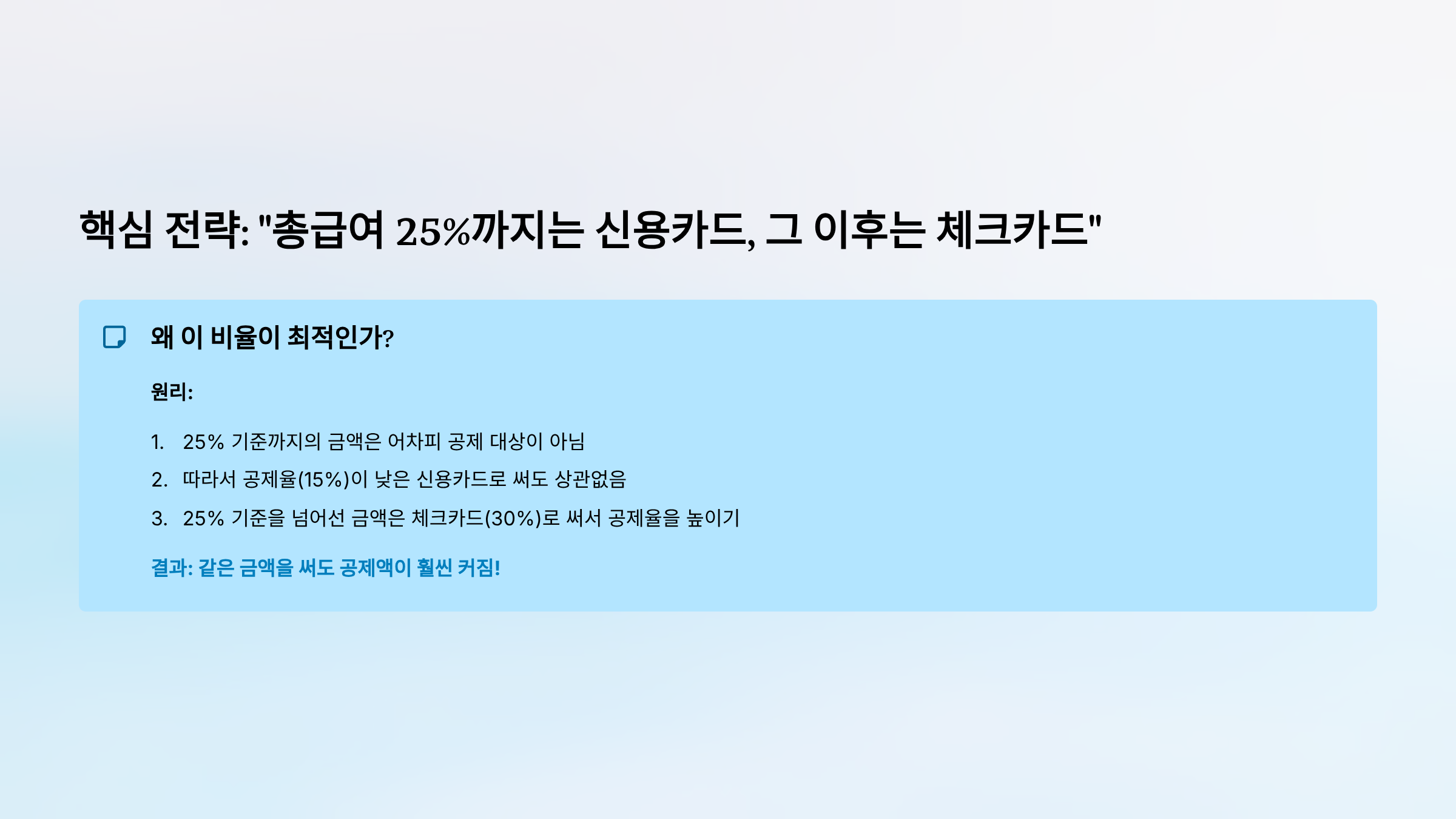 핵심 전략: "총급여 25%까지는 신용카드, 그 이후는 체크카드"