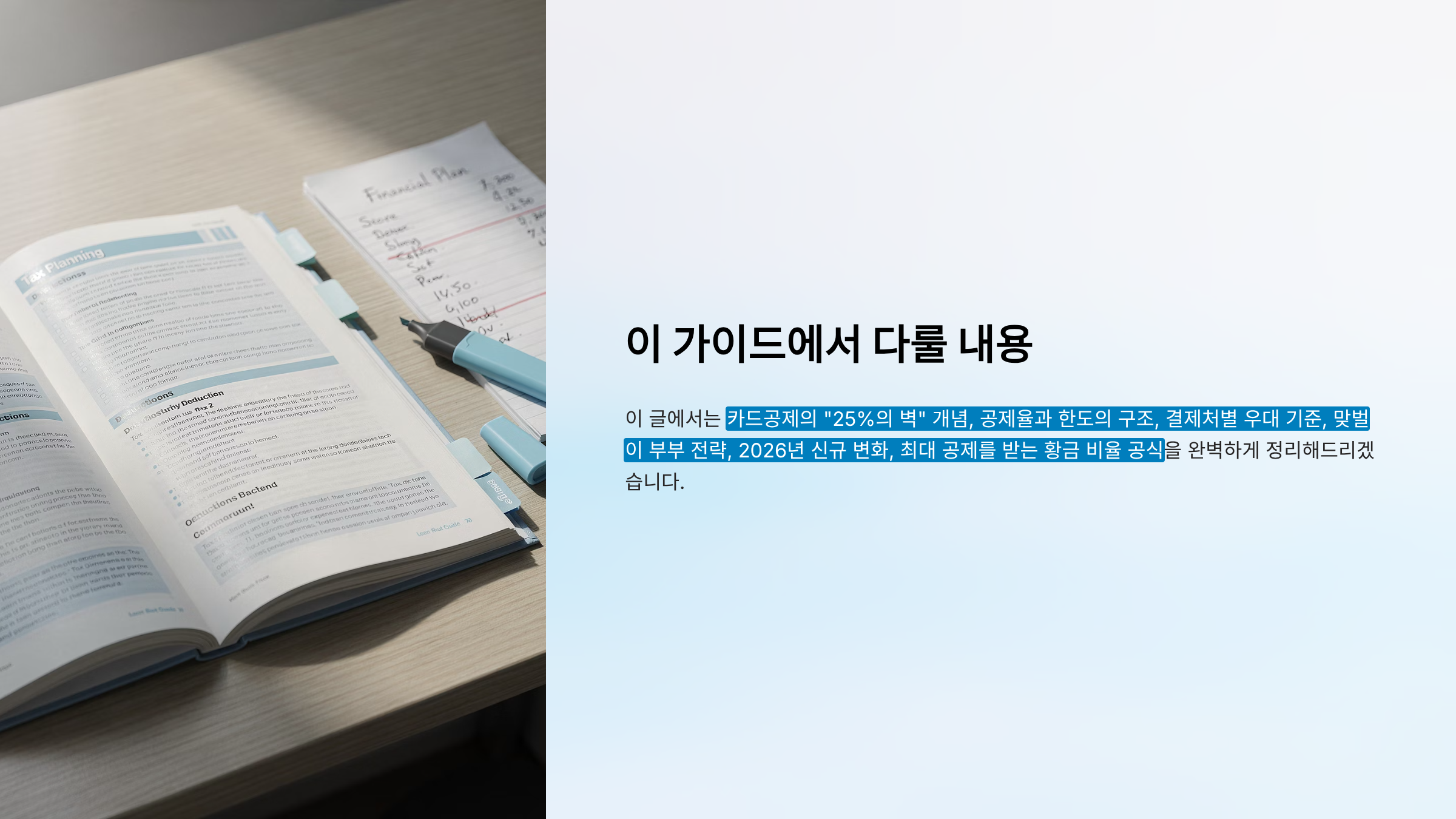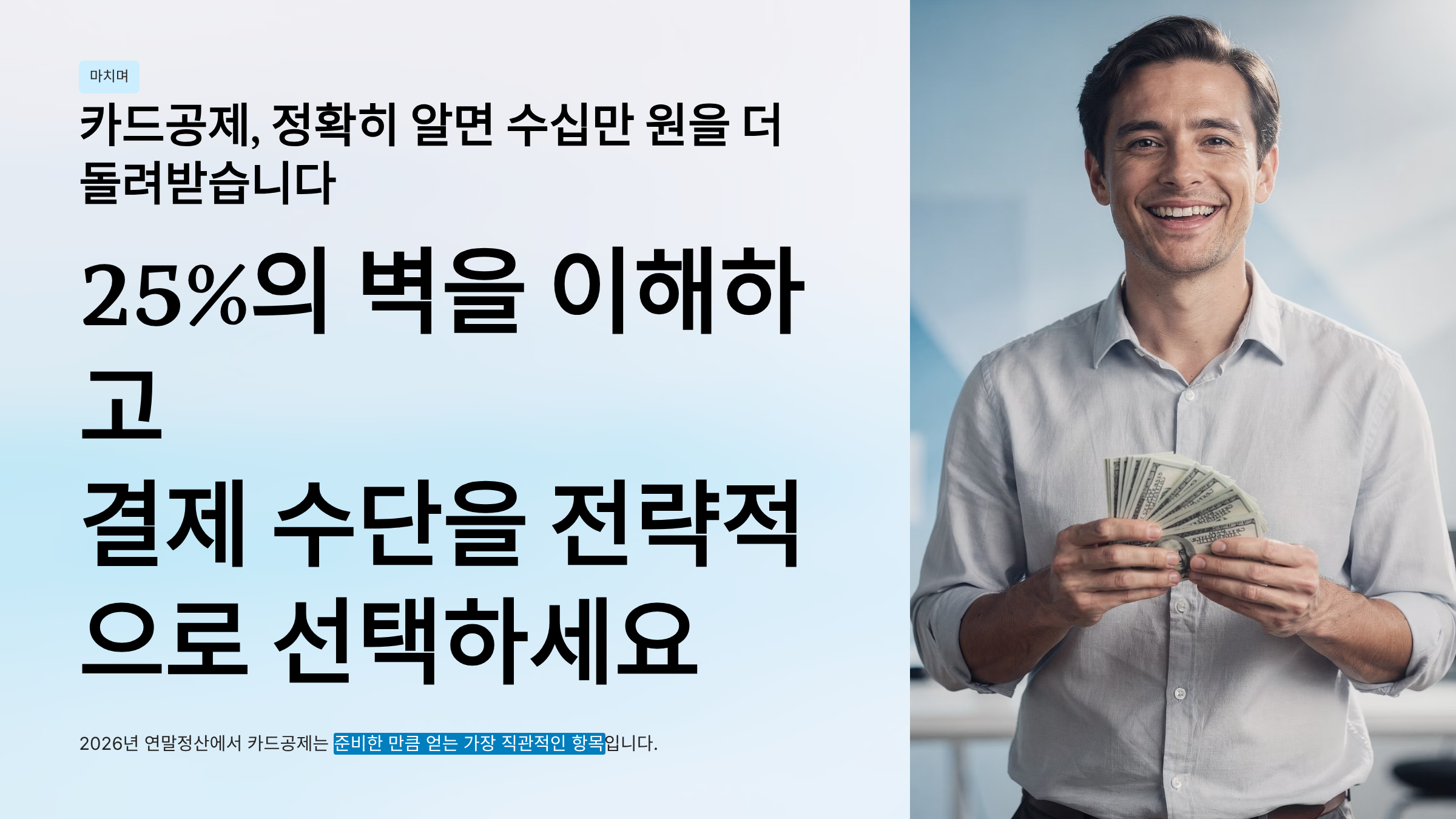 이 글에서는 카드공제의 "25%의 벽" 개념, 공제율과 한도의 구조, 결제처별 우대 기준, 맞벌이 부부 전략, 2026년 신규 변화, 최대 공제를 받는 황금 비율 공식을 완벽하게 정리해드리겠습니다.