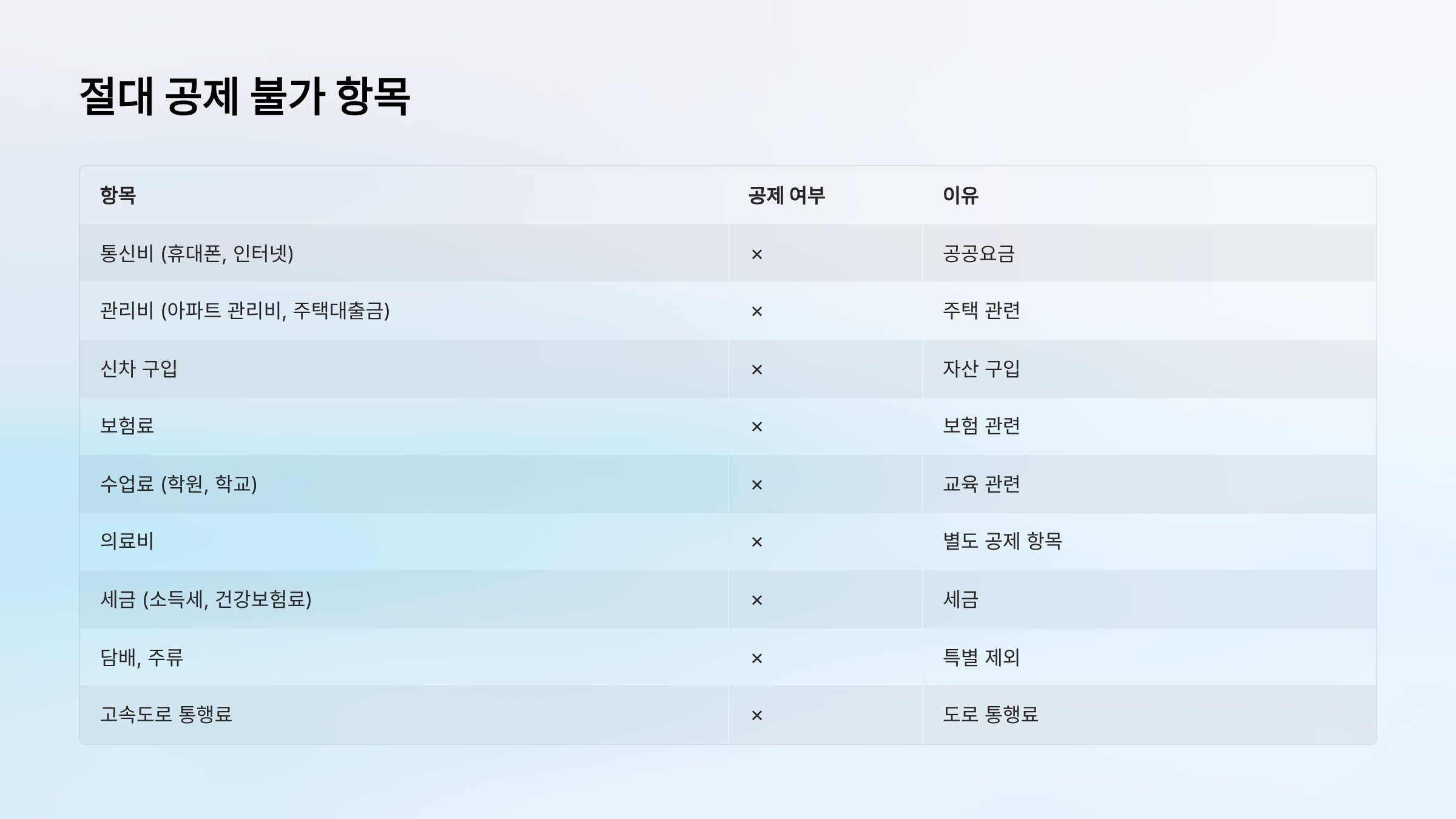 ✅ 공제 불가 항목(통신비, 관리비 등)을 제외했나?