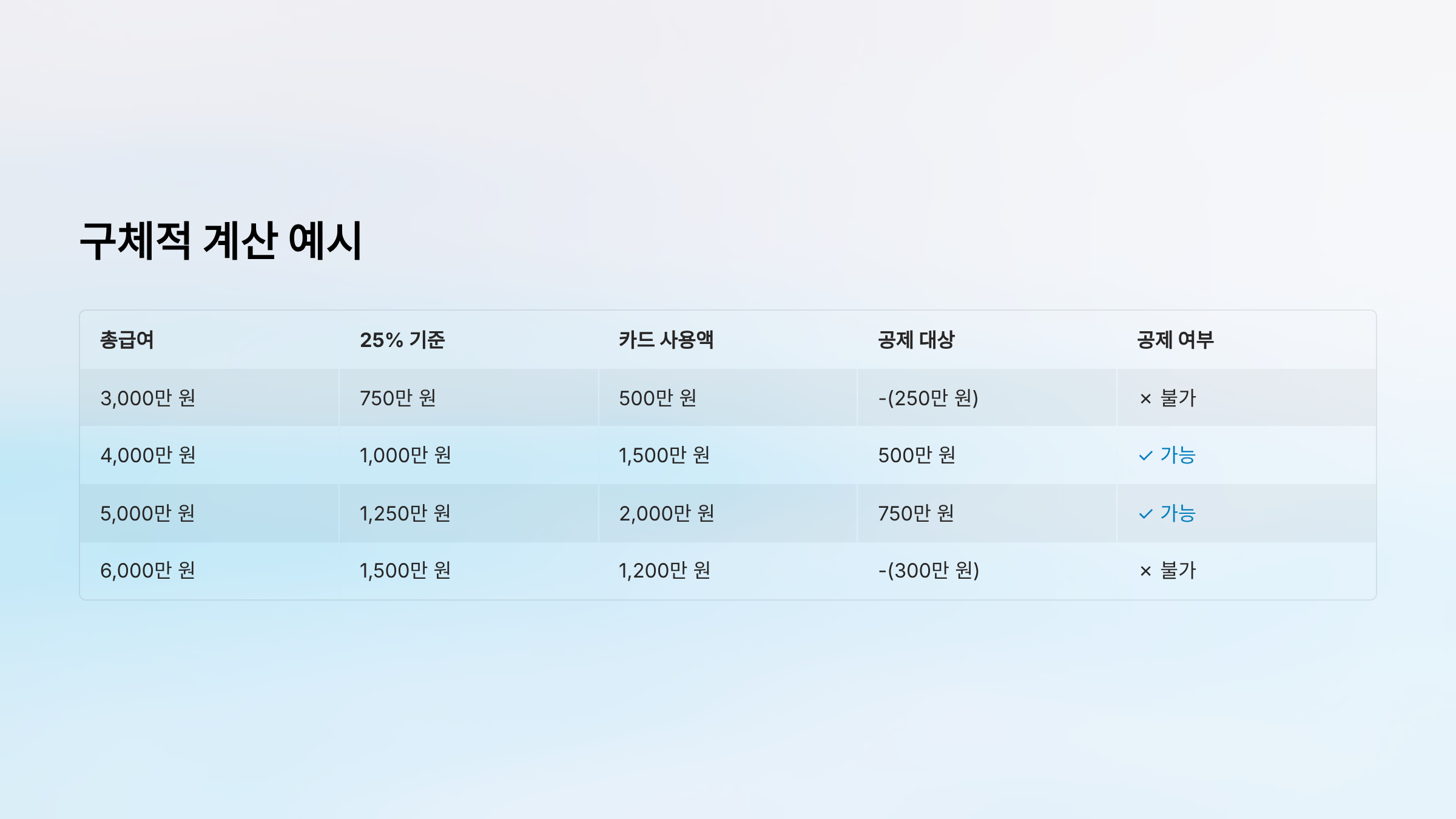 - 기본 규칙: 총급여의 25%를 초과하는 금액부터 공제 시작