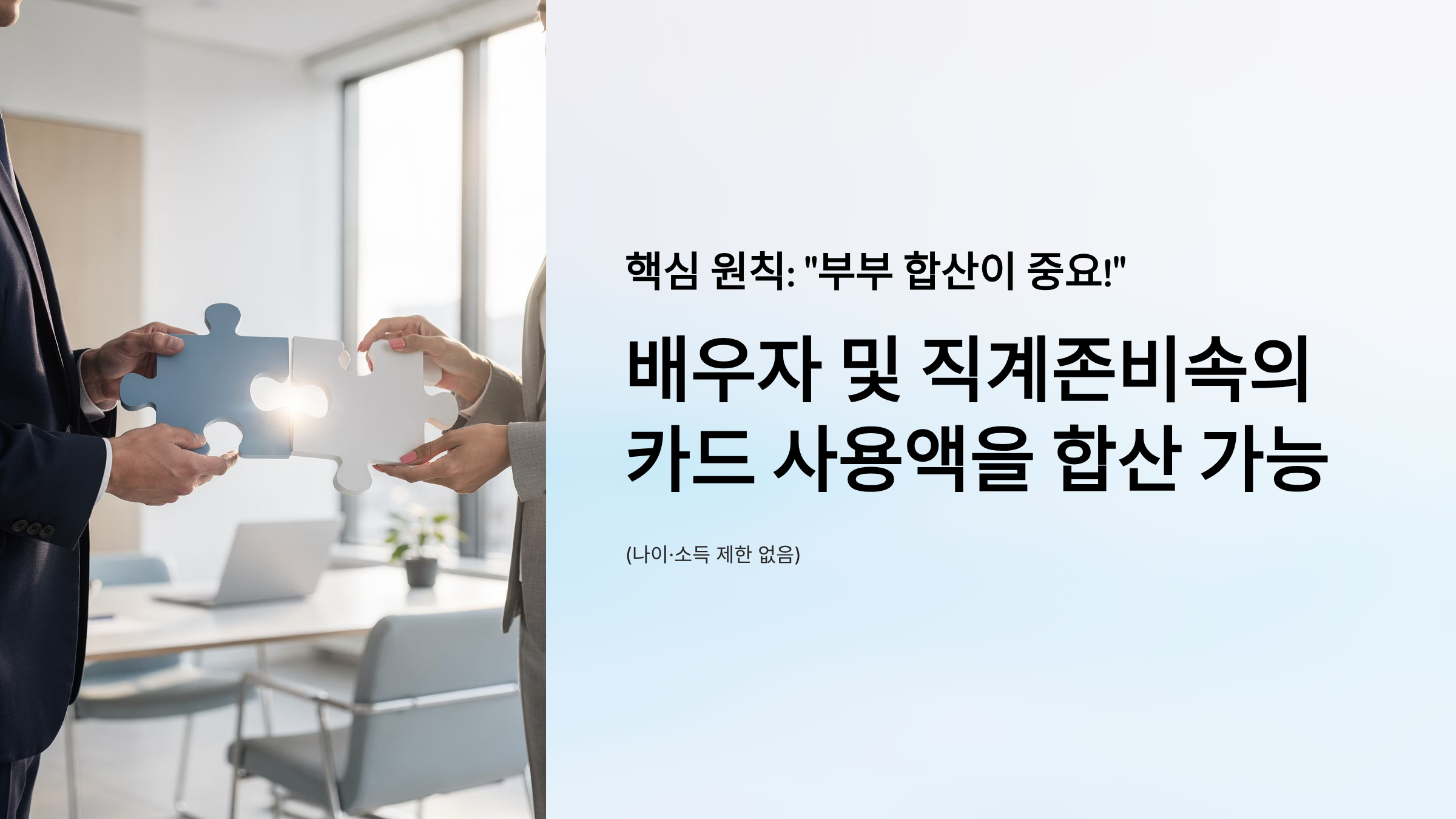 규칙: 배우자 및 직계존비속(나이·소득 제한 없음)의 카드 사용액을 합산 가능