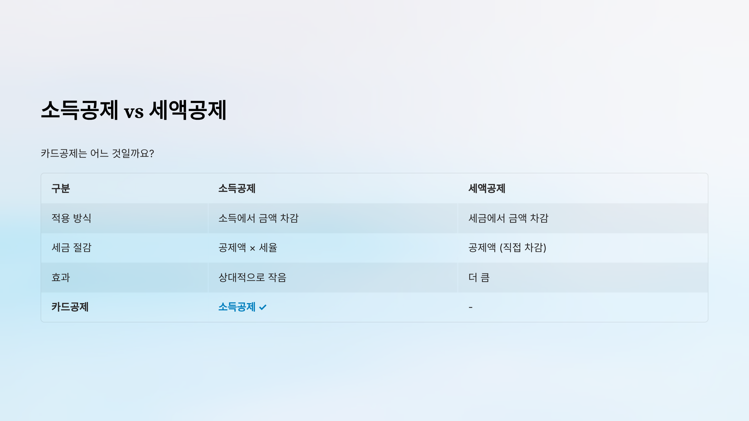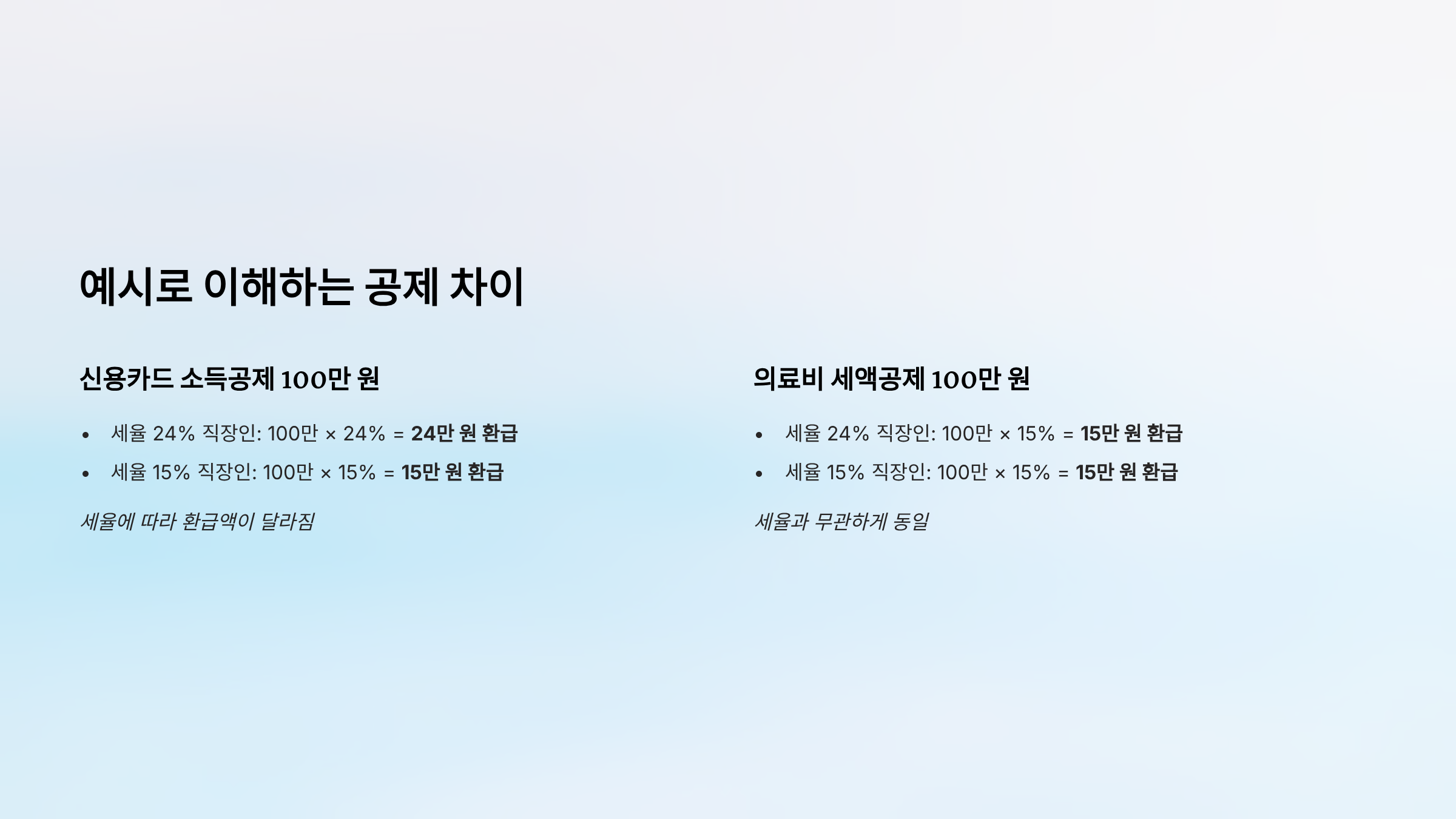 | 적용 방식 | 소득에서 금액 차감 | 세금에서 금액 차감 |