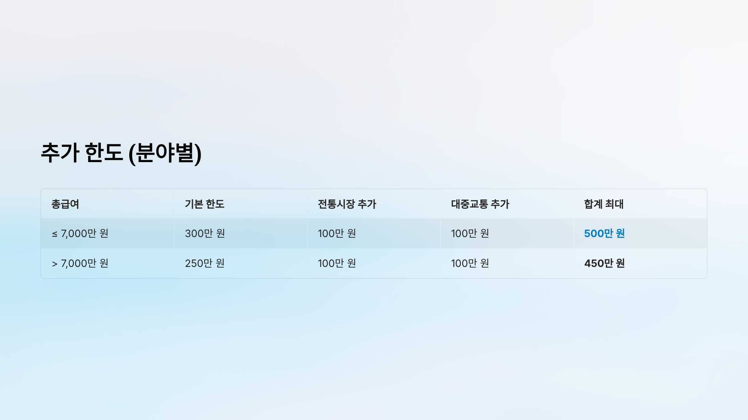 - 추가 한도: 전통시장, 대중교통, 문화비 등 분야별 추가 한도 존재