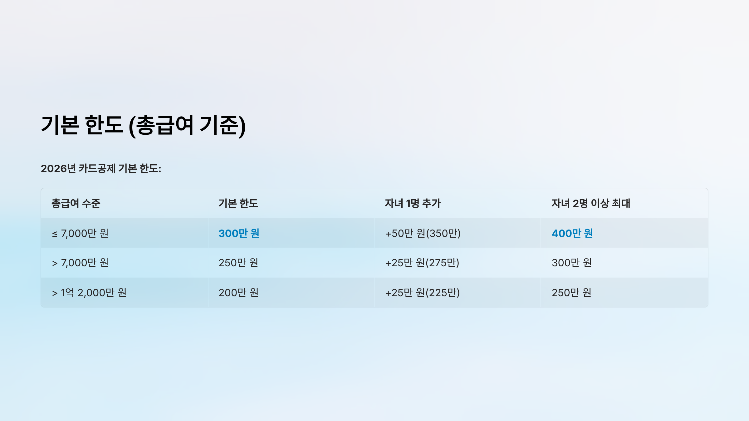 - 기본 한도: 총급여 7천만 원 이하 300만 원, 초과 시 250만 원 (자녀 수에 따라 상향)
