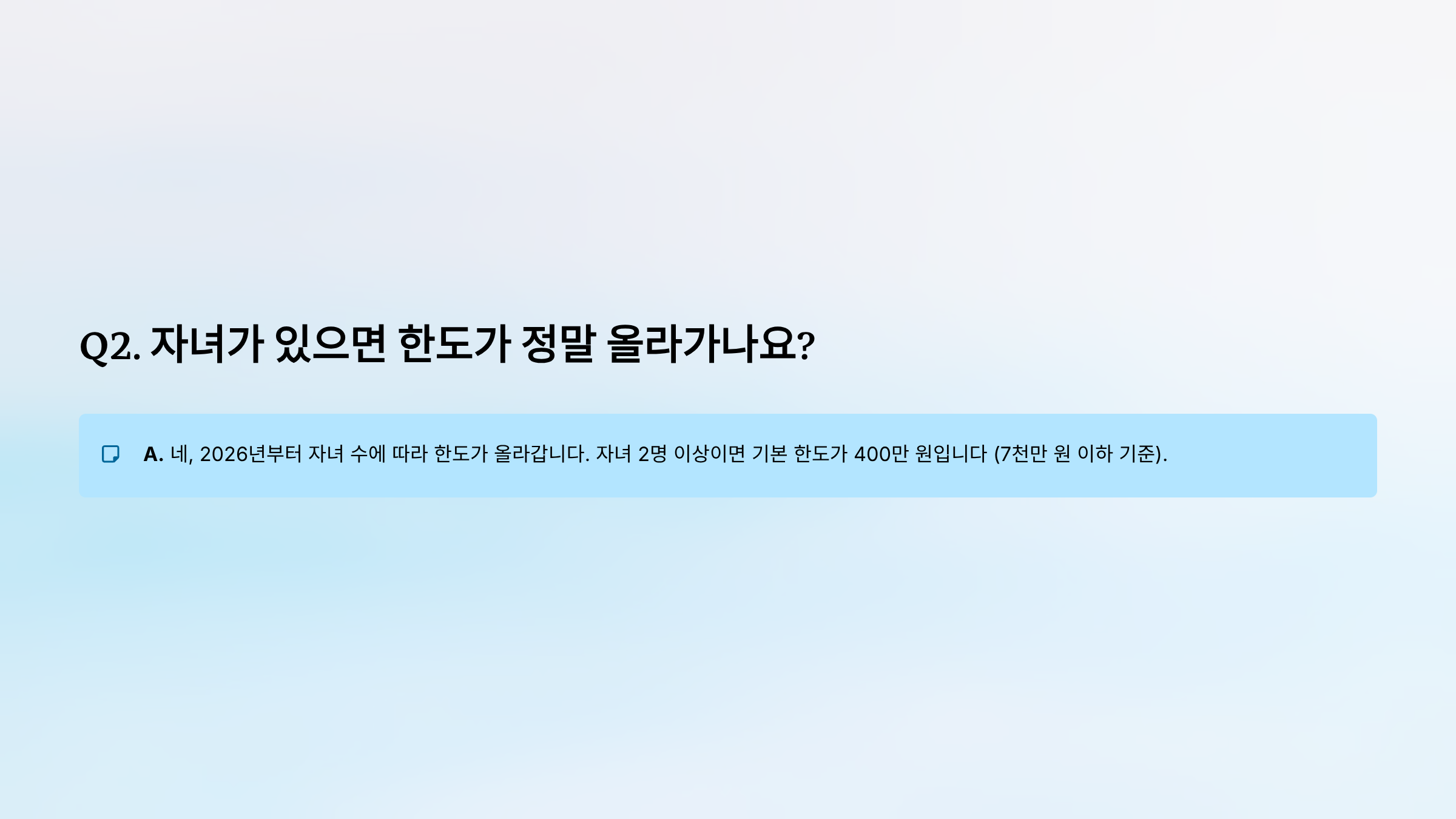 A. 네, 2026년부터 자녀 수에 따라 한도가 올라갑니다. 자녀 2명 이상이면 기본 한도가 400만 원입니다 (7천만 원 이하 기준).
