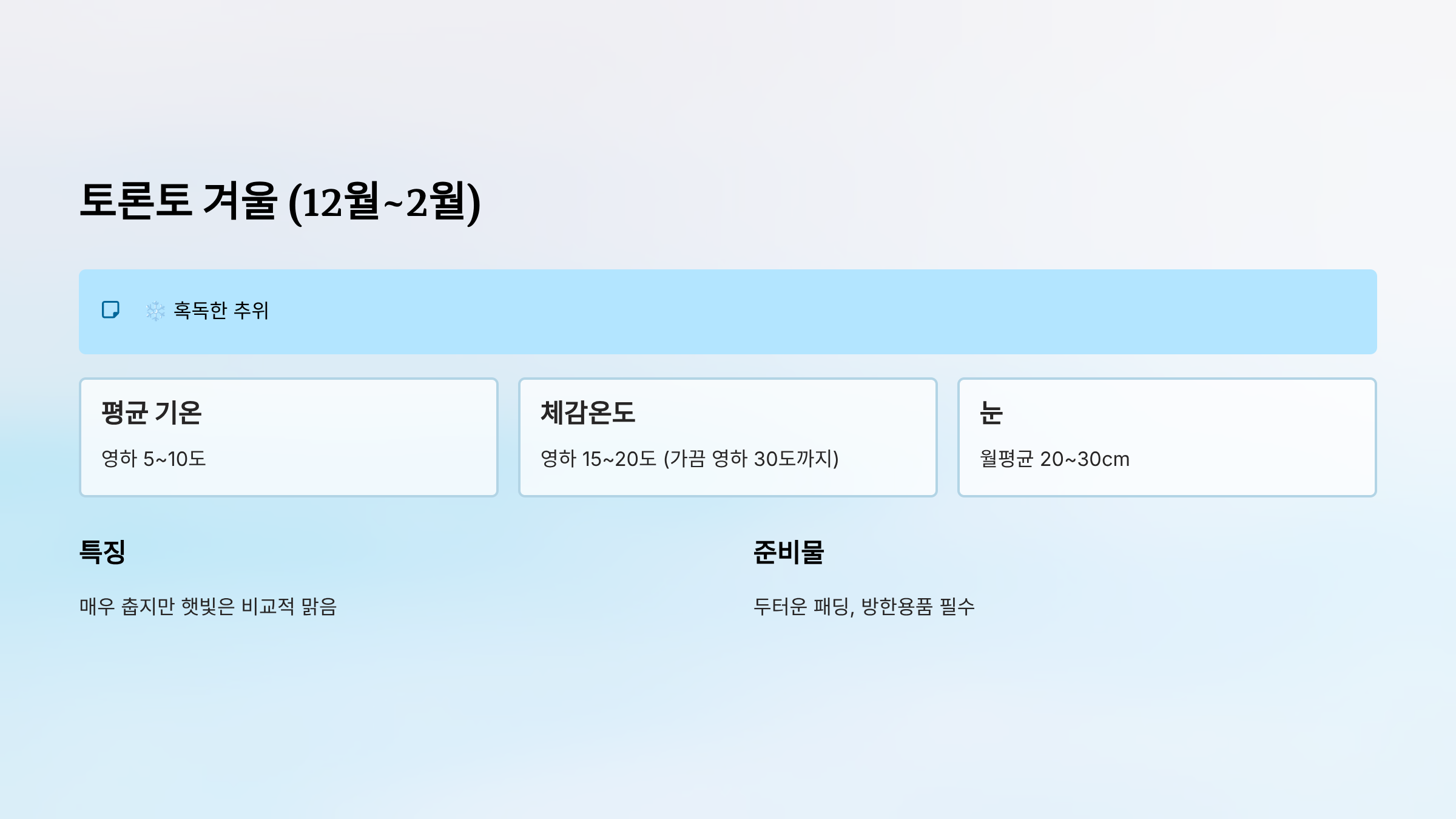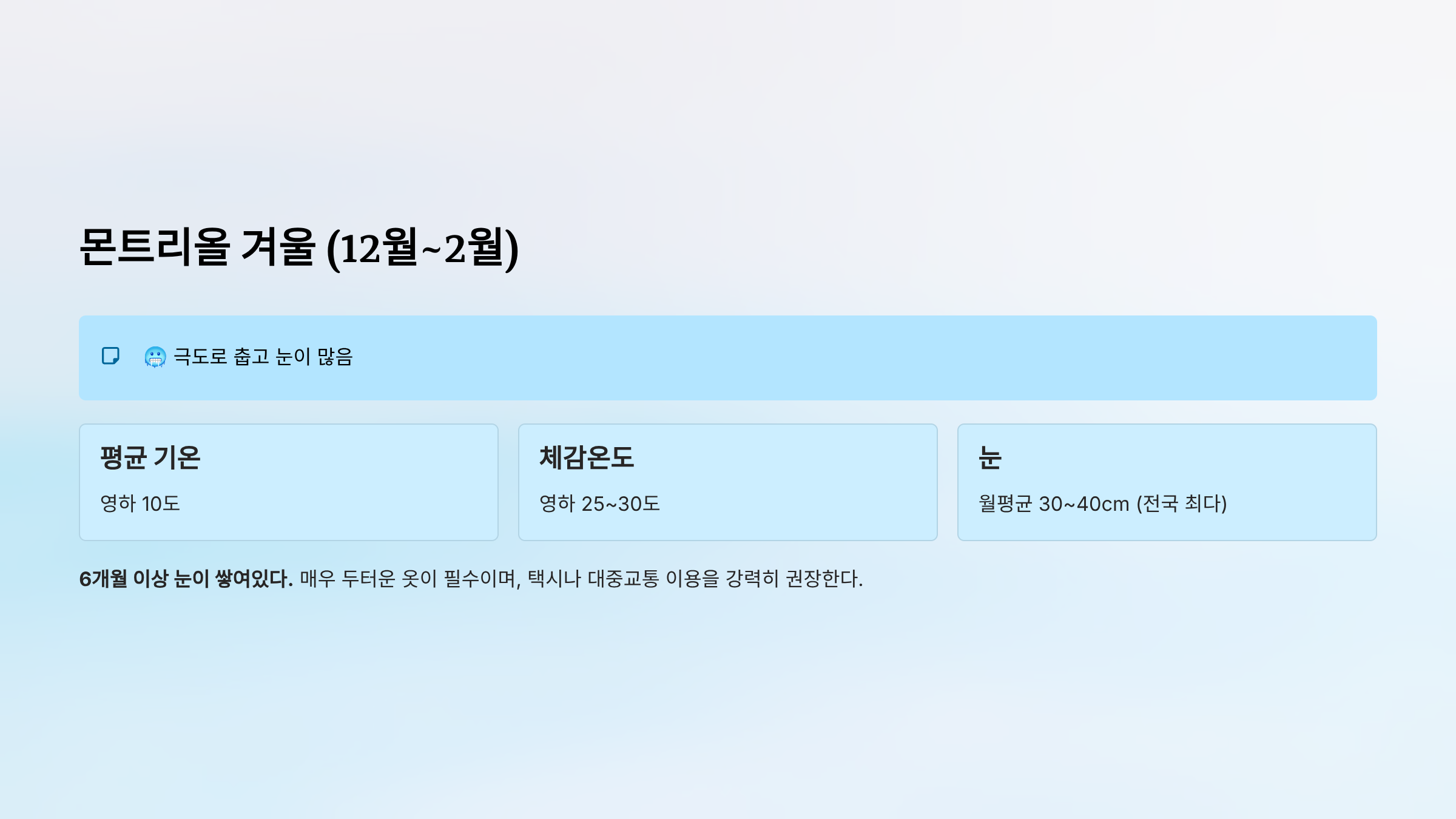 - 눈: 토론토보다 월평균 10cm 더 많음 (약 65일 이상 눈 덮임)